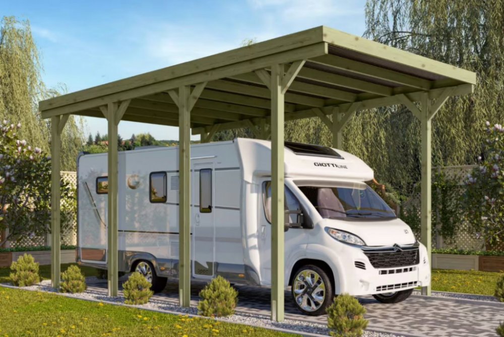 Přístřešek pro karavan - obdélníkový tvar a svými rozměry vyhovuje většině modelů karavanu. Celková zastřešená plocha je 3,94 x 7,12 m. Průjezdná výška je 350 cm. Střechu podpírá osm dřevěných sloupků 12 x 12 cm. Konstrukce přístřešku je tlakově impregnována a je tak dobře chráněna proti dřevokazným houbám i hmyzu, ale i proti nepříznivým povětrnostním podmínkám. Impregnace je zdravotně nezávadná ...