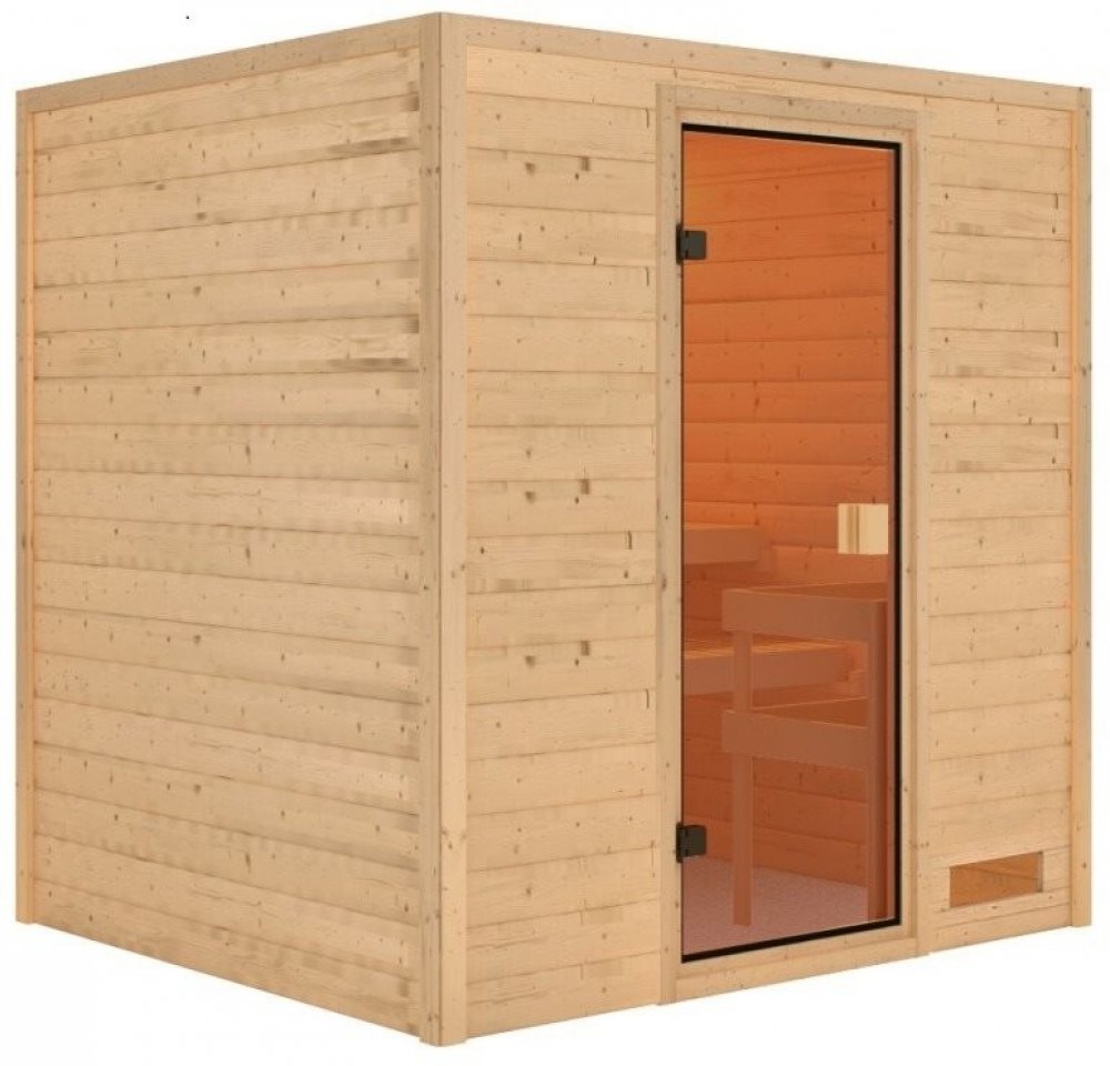 Finská sauna v naší nabídce určená až pro dvě osoby. Rozměry 195 x 169 cm. Tento model finské sauny je určený do temperovaných interiérů domu nebo bytu. Její výrobce, firma KARIBU HOLZTECHNIK z německých Brém, dokázala svými výrobky úspěšně navázat na staletou tradici skandinávského saunování a současně do ní zapracovat dnešní moderní technologie. Sauna je celá vyrobena ze dřeva severského smrku v přírodním provedení. Dřevo pochází ze vzdáleného severu Evropy a je chemicky naprosto neošetřené (není ani namořeno ani nalakováno). V důsledku toho je prosté všech známých problematických látek, které by se v průběhu saunování mohly ze dřeva uvolňovat. Tato interiérová sauna je vyrobena z masivního dřeva síly 38 mm. Stěny sauny jsou složeny ze speciálně hlazených prken s dvojitým perem a drážkou, což garantuje neobyčejnou pevnost spoje.