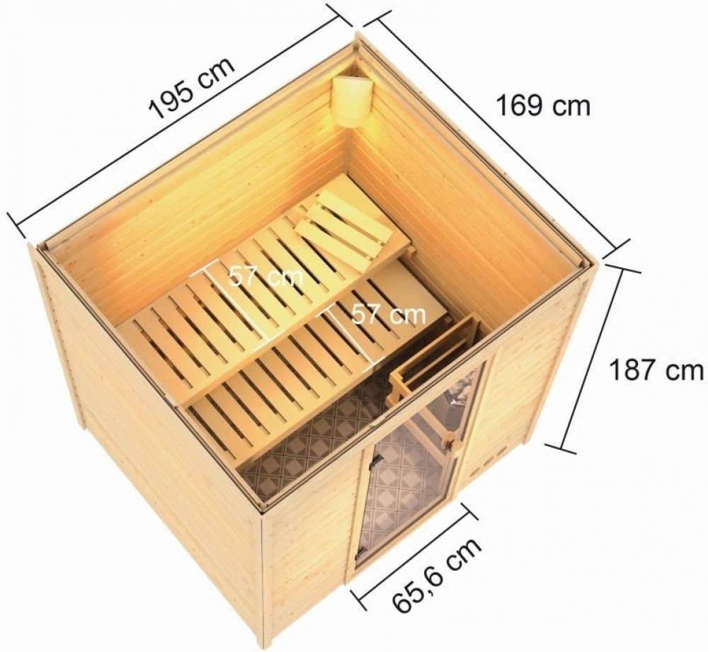 Výbava a příslušenství:Obsahem standardního balení je 2x lavice ze smrkového dřeva (2x šířka 57 cm, max 250 kg) a dřevěný ochranný rám na kamna. Doporučujeme další saunové příslušenství z naší nabídky.