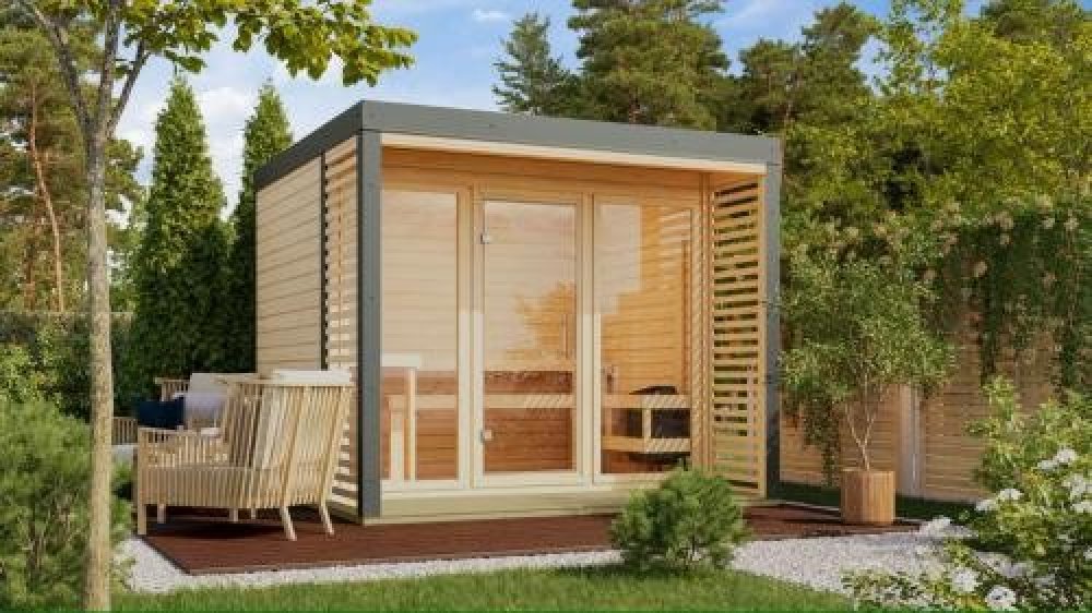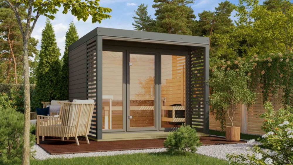 barva: přírodní dřevo (sauna) + antracitové oplechování