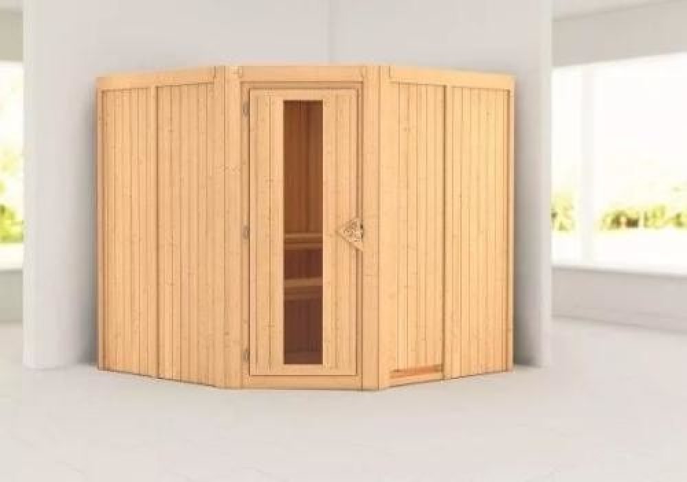 Finská sauna pro dvě osoby. Má čtvercový tvar š 196 x h 196 x v 198cm s rohovým vstupem. Tento model finské sauny je určený do temperovaných interiérů domu nebo bytu. Její výrobce, firma KARIBU HOLZTECHNIK z německých Brém, dokázala svými výrobky úspěšně navázat na staletou tradici skandinávského saunování a současně do ní zapracovat dnešní moderní technologie. Sauna je celá vyrobena ze dřeva severského smrku v přírodním provedení. Dřevo pochází ze vzdáleného severu Evropy a je chemicky naprosto neošetřené (není ani namořeno ani nalakováno). V důsledku toho je prosté všech známých problematických látek, které by se v průběhu saunování mohly ze dřeva uvolňovat. Tato interiérová sauna vykazuje mimořádné tepelně-izolační vlastnosti. Stěny sauny jsou složeny z vnitřní a vnější vrstvy speciálně hlazených prken s perem a drážkou, mezi kterými je 42 mm silná tepelná izolace v podobě minerální vlny. Celková síla stěny je tak 68 mm. Zadní nebo boční nepohledové strany orientované ke stěně místnosti mají vnější stranu ze sololitu. Proto jsou při stejné tepelné izolaci o cca 10 mm tenčí než pohledové strany pokryté palubkami.