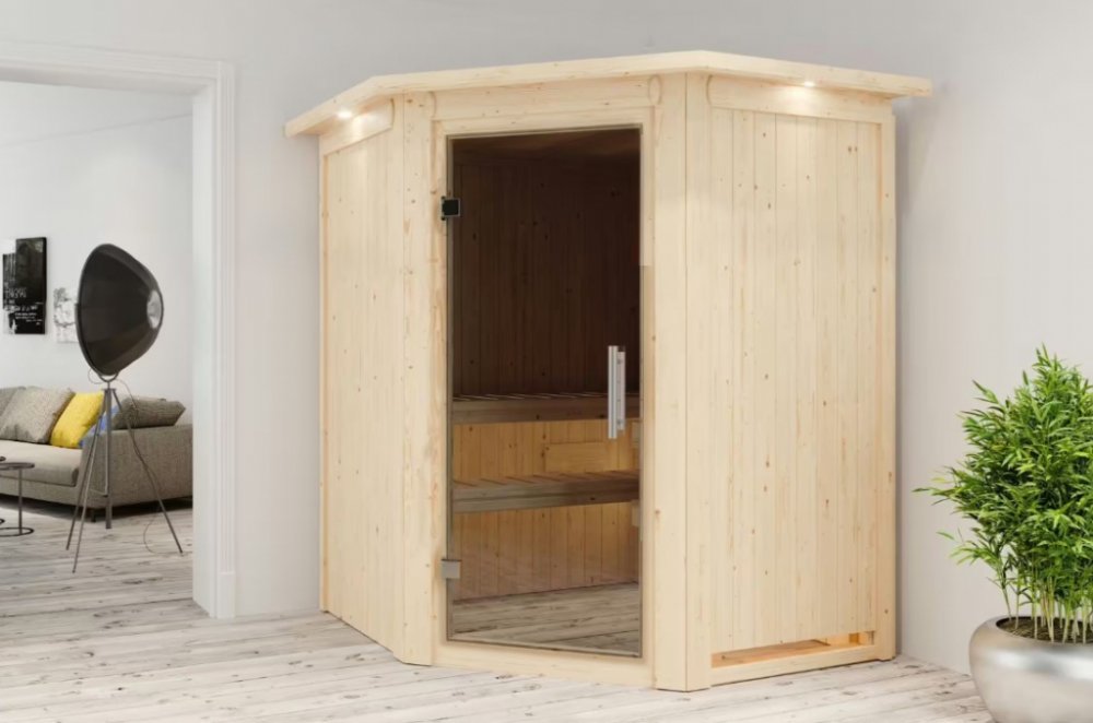 Malá finská sauna určená až pro dvě osoby. Má rozměr š 151 x h 151 x v 198 cm s rohovými dveřmi. Tento model finské sauny je určený do temperovaných interiérů domu nebo bytu. Její výrobce, firma KARIBU HOLZTECHNIK z německých Brém, dokázala svými výrobky úspěšně navázat na staletou tradici skandinávského saunování a současně do ní zapracovat dnešní moderní technologie. Sauna je celá vyrobena ze dřeva severského smrku v přírodním provedení. Dřevo pochází ze vzdáleného severu Evropy a je chemicky naprosto neošetřené (není ani namořeno ani nalakováno). V důsledku toho je prosté všech známých problematických látek, které by se v průběhu saunování mohly ze dřeva uvolňovat. Tato interiérová sauna vykazuje mimořádné tepelně-izolační vlastnosti. Stěny sauny jsou složeny z vnitřní a vnější vrstvy speciálně hlazených prken s perem a drážkou, mezi kterými je 42 mm silná tepelná izolace v podobě minerální vlny. Celková síla stěny je tak 68 mm. Zadní nebo boční nepohledové strany orientované ke stěně místnosti mají vnější stranu ze sololitu. Proto jsou při stejné tepelné izolaci o cca 10 mm tenčí než pohledové strany pokryté palubkami.