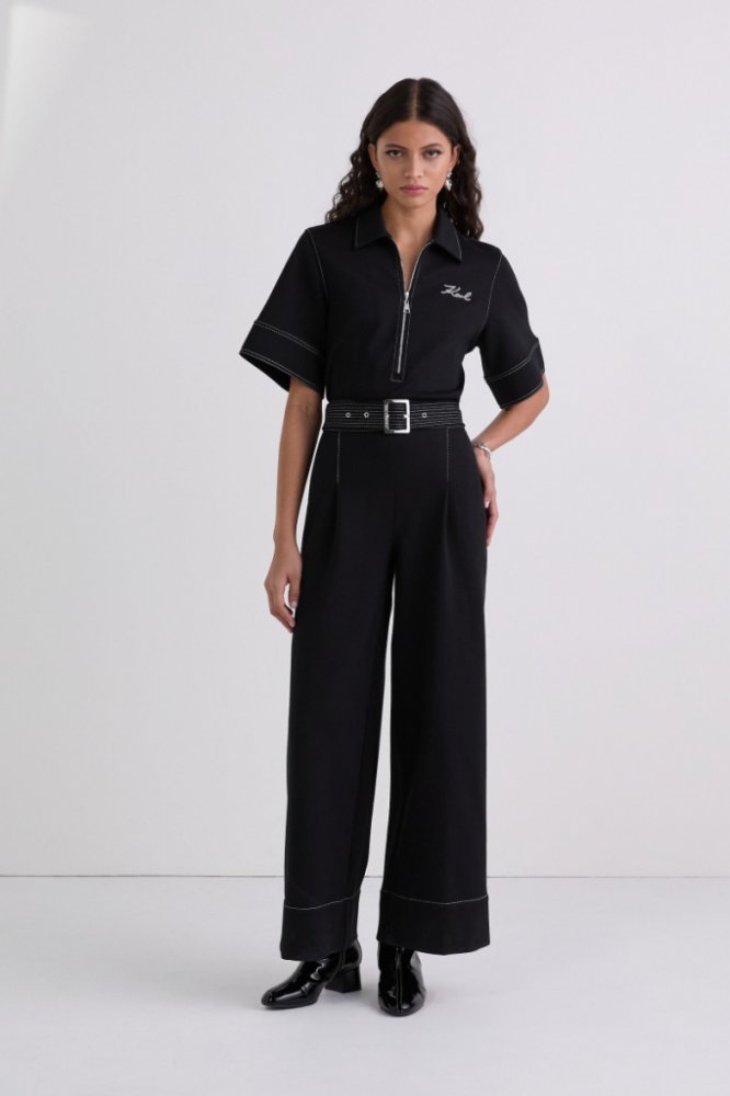 Dámský overal s krátkým rukávem. Mimořádně lichotivá silueta s širokými nohavicemi a zapínáním na zip vpředu doplňuje výrazný pás pro tvarování postavy. Kontrastní prošívání, inspirované vášní Karla Lagerfelda pro výrazné linie, se kombinuje s výšivkou Karl Signature na levé straně hrudníku. Pohodlný úplet ve kvalitním materiálovém složení zaručuje dokonalou pružnost a maximálně příjemný pocit při nošení. Žensky velmi rafinovaný a skvěle kombinovatelný kousek pro váš denní i večerní styling.