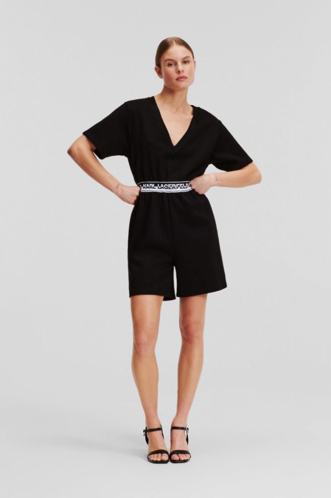 Dámský overal s krátkým rukávem a výstřihem do V. Je vyroben z organické bavlny, přizpůsobený do přiléhavé siluety s volnými kalhotami a nabízí mladistvý, ale zároveň nadčasový vzhled. Nepřehlédnutelná páska s logem KARL zvýrazňuje stahnutý pas a proměňuje ležérní základní model v nepřehlédnutelný výrazný kousek.