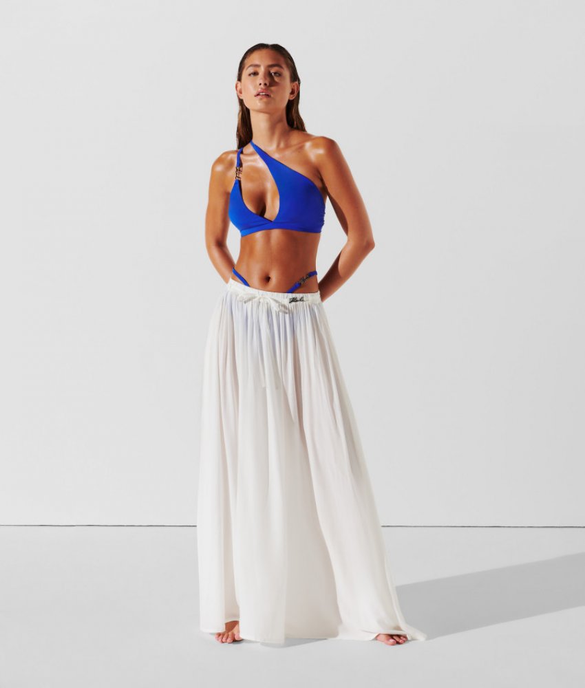 Dámská plážová maxi sukně je nezbytným letním doplňkem. Volný, prodyšný design doplňuje elastický pas zdobený kovovým logem Karl Signature. Materiálové složení z viskózových vláken zaručuje měkký, prodyšný a příjemně chladivý pocit během nošení. Tato plážová sukně je ztělesněním sofistikované letní elegance, kterou si v letních dnech nenechte ujít v kombinaci s plavkami Karl.