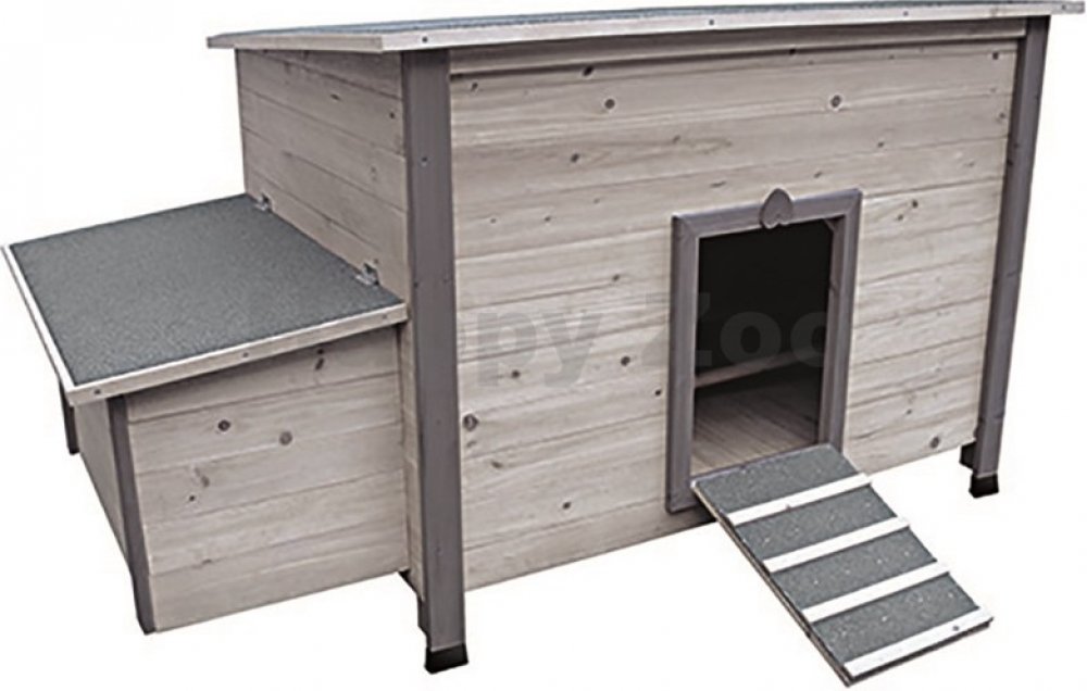 Flamingo dřevěné pro slepice šedé jednopatrové vyvýšené pultová se standardním zabezpečením 149.0 cm 79.0 cm 80.0 cm 25.8 kg 2 ks pro střední chov (5–10 ks)