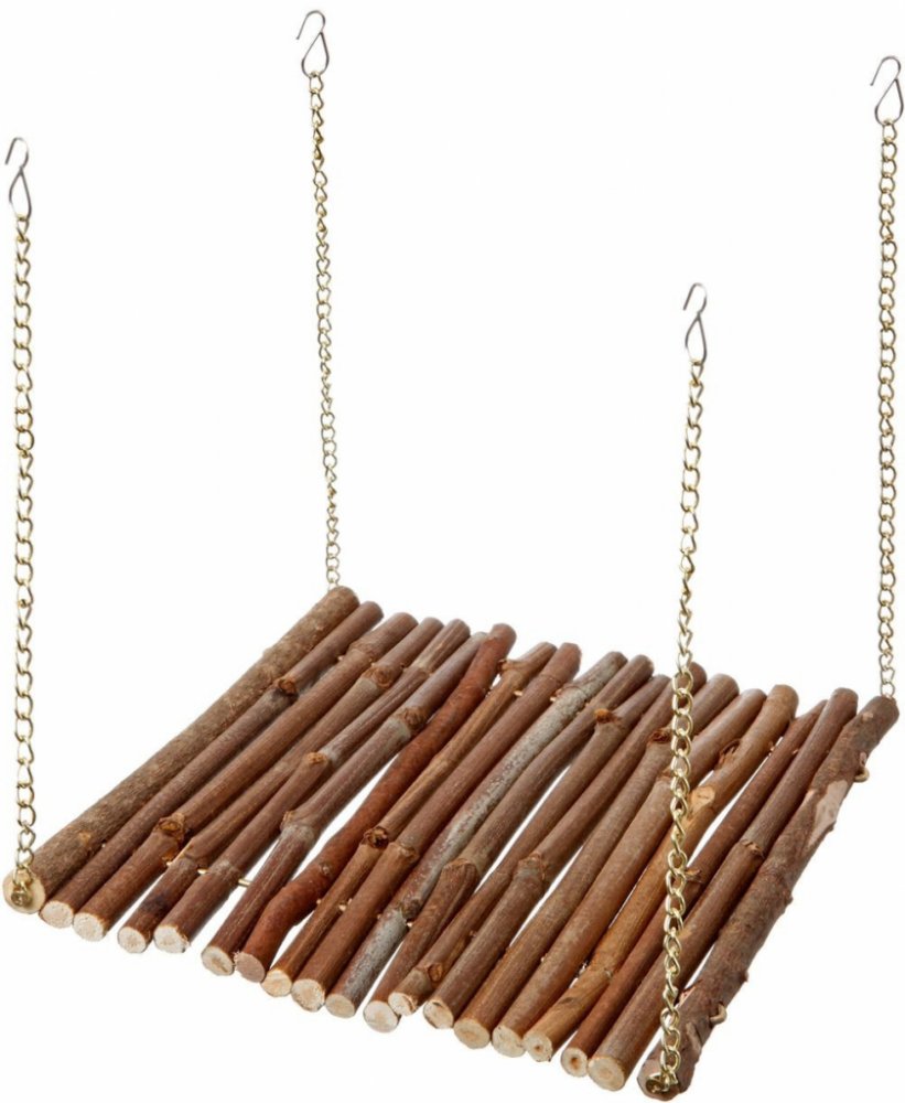 Dřevěná houpačka z větviček, opatřená řetízky na zavěšení v kleci.