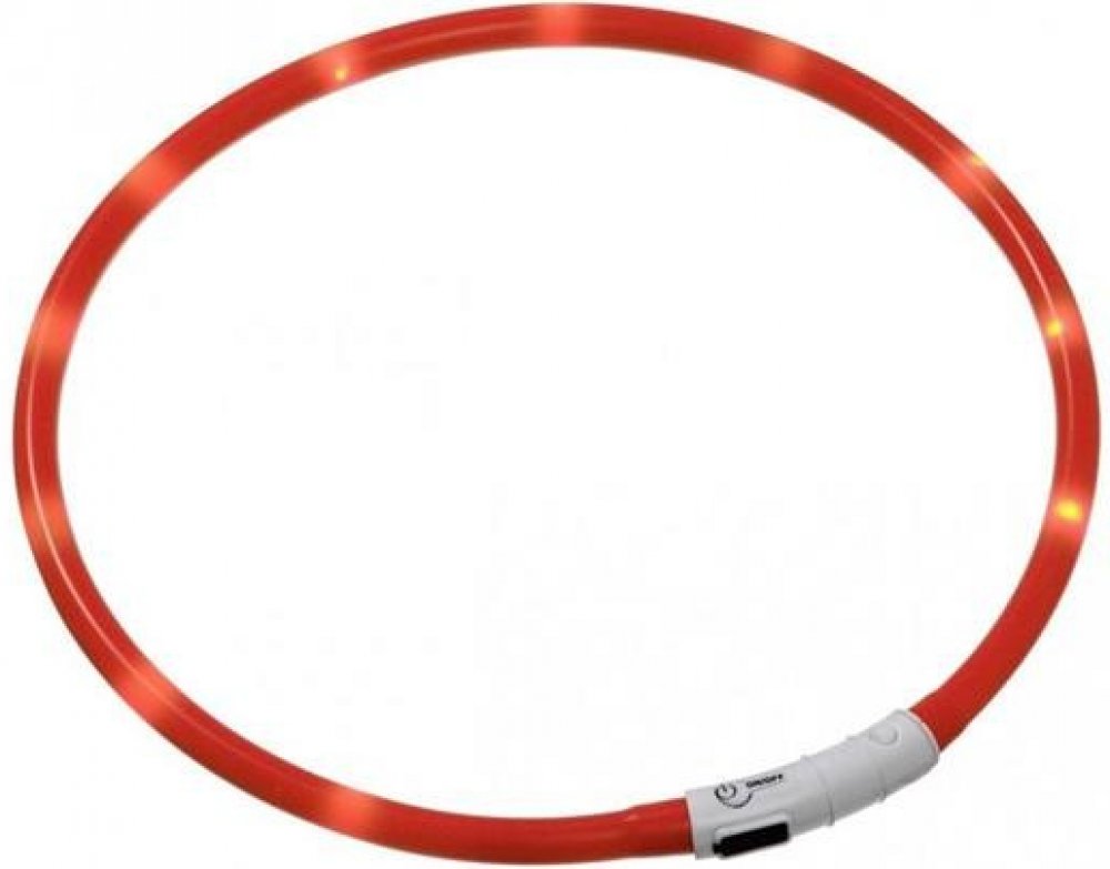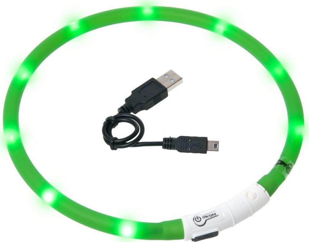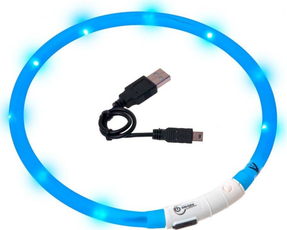 Odolný svítící obojek pro psy - silikonový obal v sobě skrývá LED diody, které mohou nepřetržité svítit nebo blikat. Obojek lze zastřihnutím zkrátit na libovolný obvod krku, je voděodolný. Součástí je USB kabel. Obojek lze zkrátit na délku 20-75cm, tři možnosti nastavení svícení.