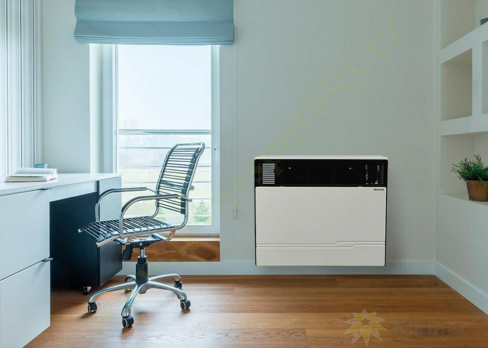Plynové topidlo o výkonu 4,6 kW s odtahem spalin přes zeď je vybaveno mechanickou regulací teploty – termostatem,a piezozapalovačem, kterým se zapaluje věčný plamínek.