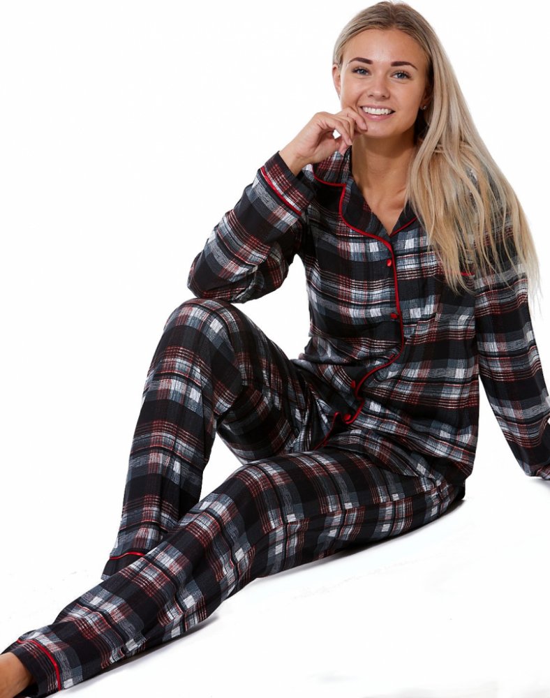 Černošedé i vínové a červené kárované elegantní pyžamo celopropínací na kojení do porodnice