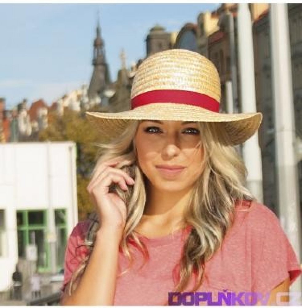 Karpet dámský slaměný klobouk zdobený rypsovou stuhou červená