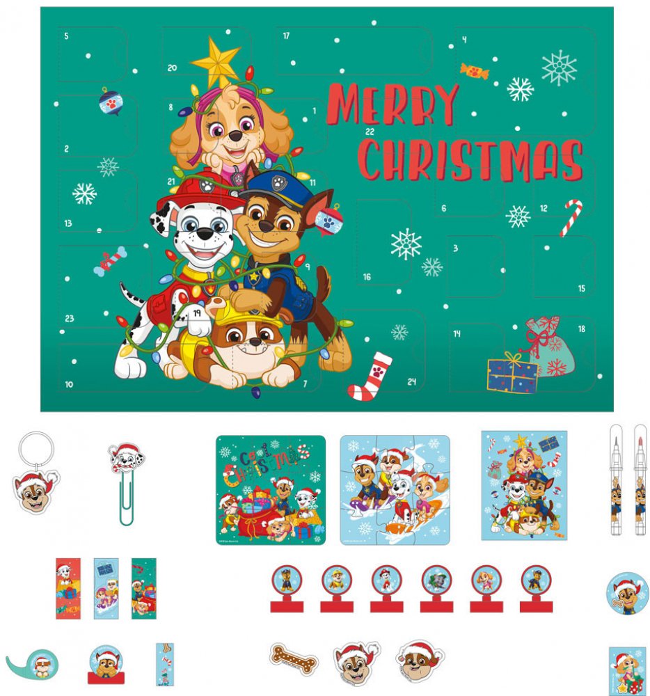 Adventní kalendář Paw Patrol Obsah: 6 Mini razítka, 2 puzzle, 1 kroužek na klíče, páska + dávkovač, 3 laserové nálepky, mini tužka, mini pastelka, 2 třepací nálepky, 2 kancelářské sponky, poznámkový blok, 3 tvarované gumy, Washi páska
