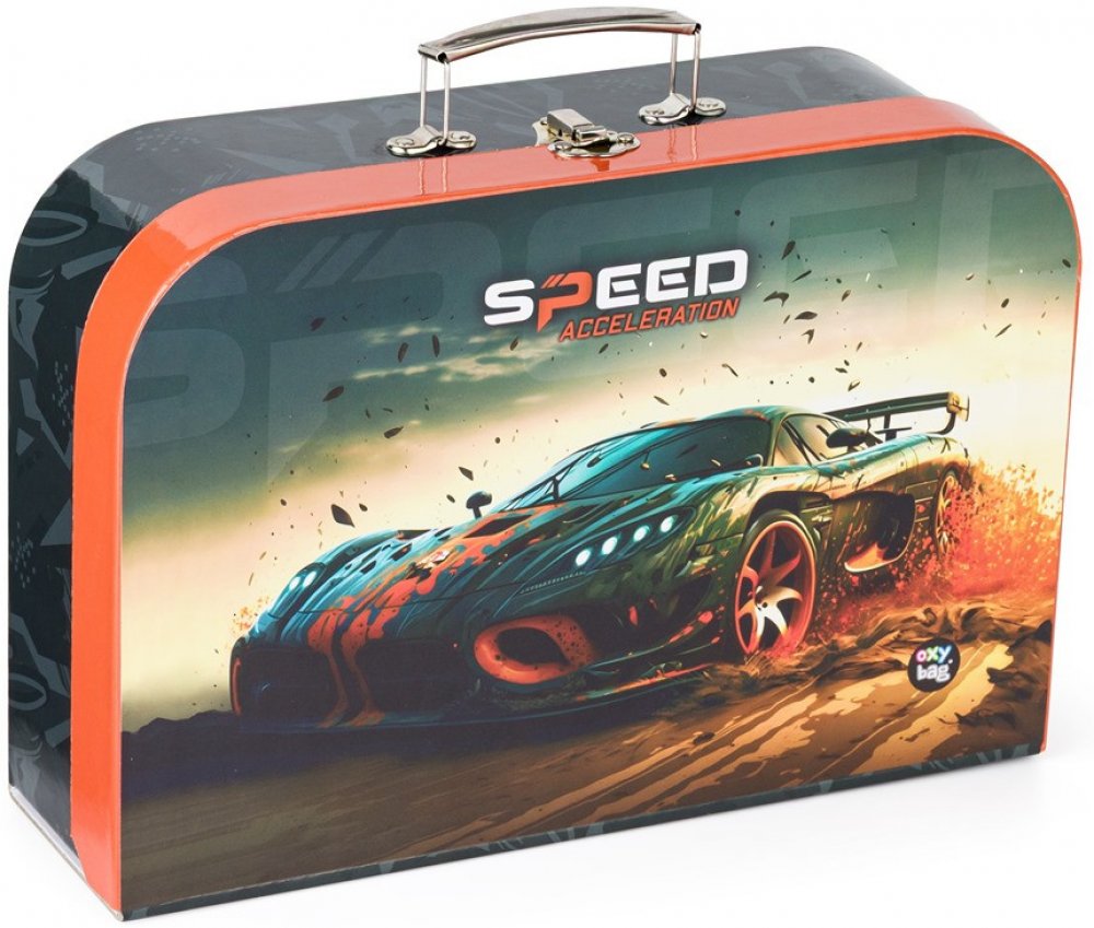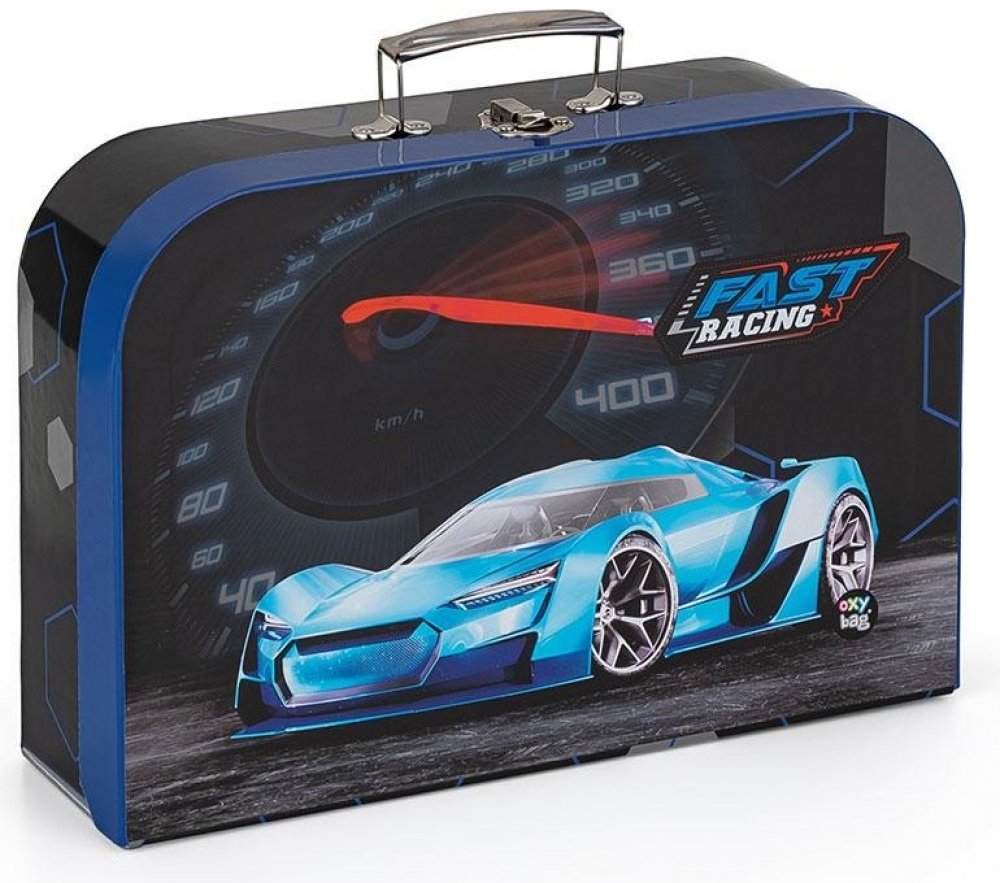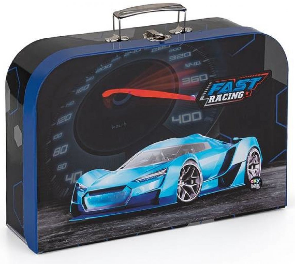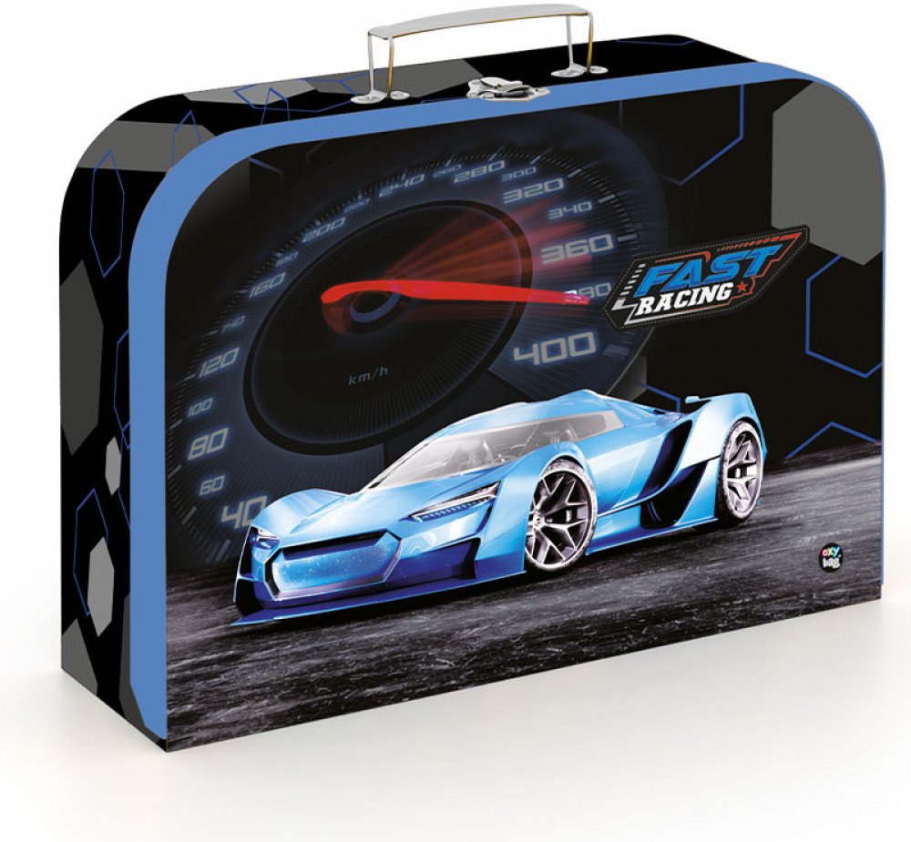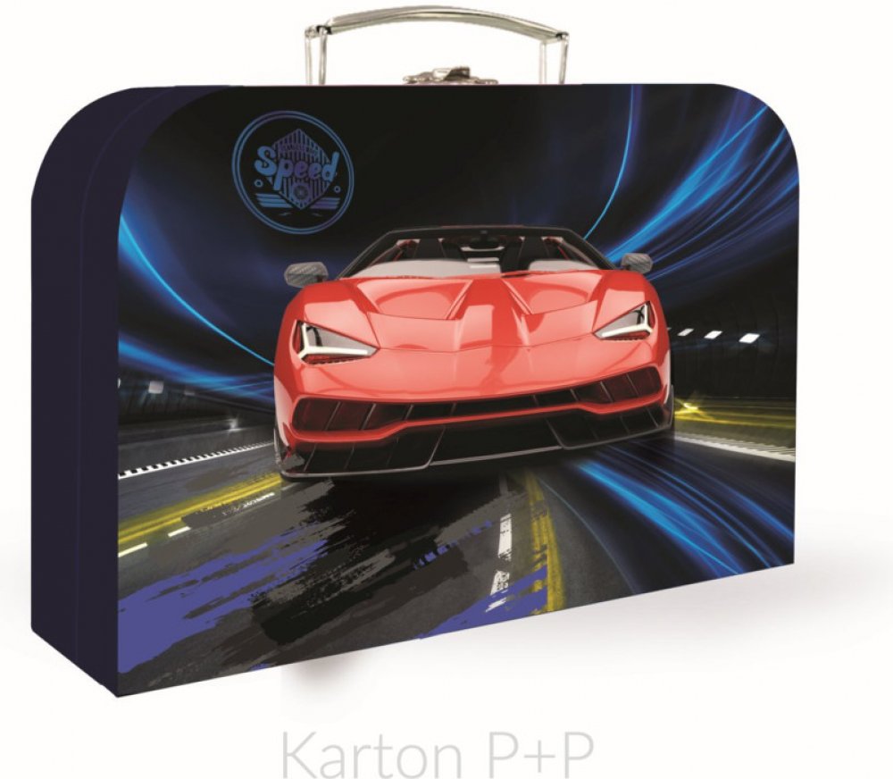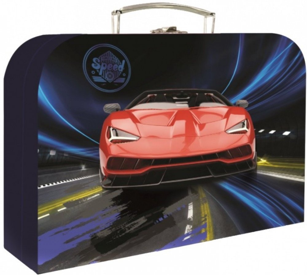 Lamino kufřík na výtvarnou výchovu. Do kufříku se vejde formát A4. Materiál: papír, lepenka, kovový zámeček, kovové nýty. Kufřík lamino 34 cm auto
