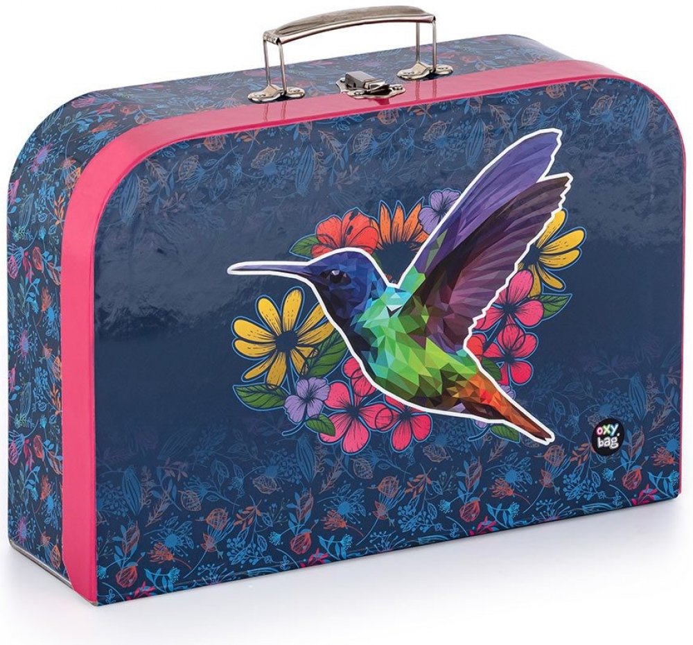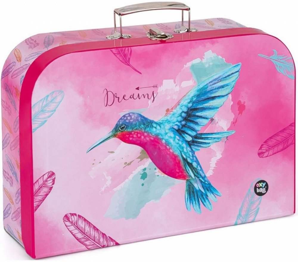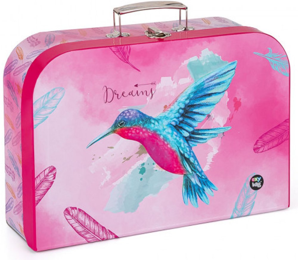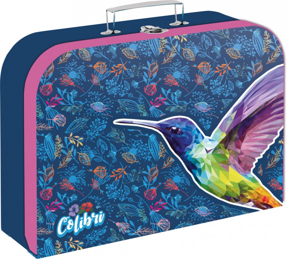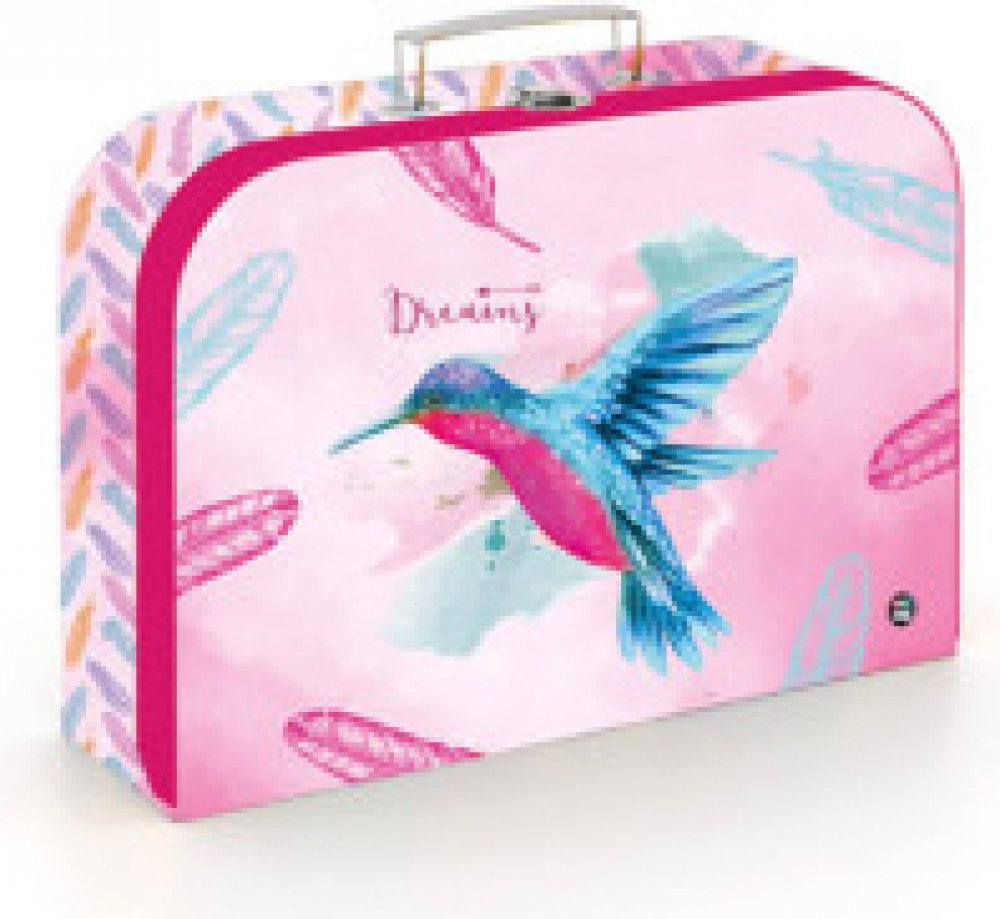 Krásný dětský kufřík s motivem kolibříka v růžové barvě, vhodný na úschovu dětských pomůcek, výtvarných potřeb, hraček atd.