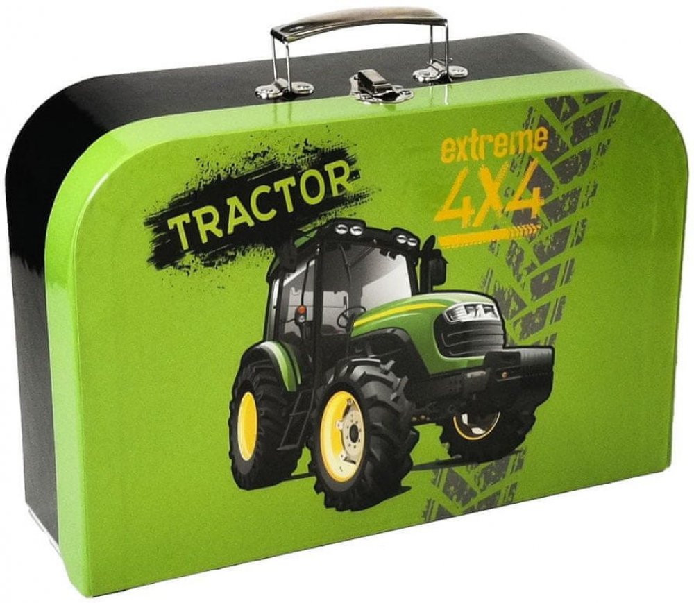 Materiál: papír, lepenka, kovový zámeček, kovové nýty. Kufřík lamino 34 cm traktor
