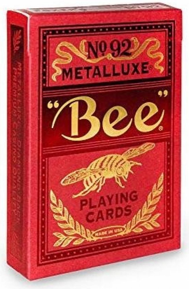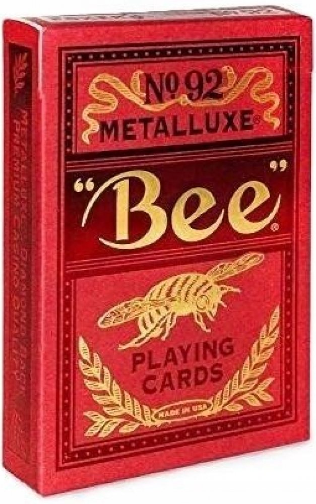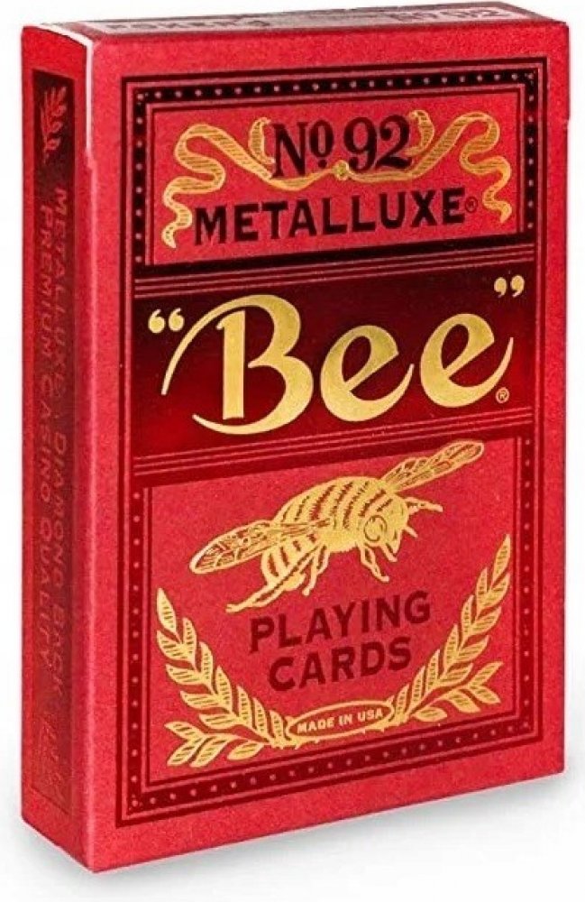 Hrací karty Bee MetalLuxe lisované pravým kovem se vyznačují vynikajícím odrazem světla a zaručují nejvyšší úroveň luxusu. Hrací karty Bee MetalLuxe jsou prvními kartami značky Bee využívajícími technologii metalické fólie USPCC MetalLuxe. Bez ohledu na to, zda hrajete karetní hry, jako je poker, blackjack nebo remik, nebo tyto karty používáte k provádění magických nebo karetních pohybů... Hrací karty Bee MetalLuxe jsou připraveny vás ohromit!