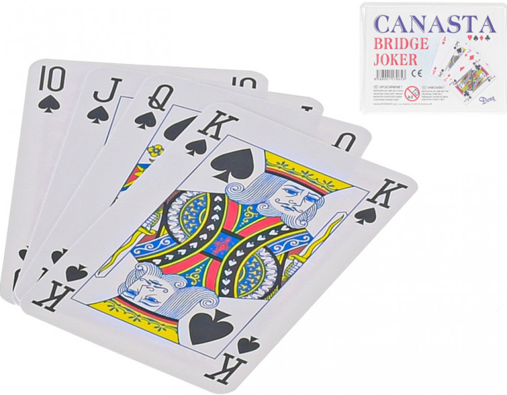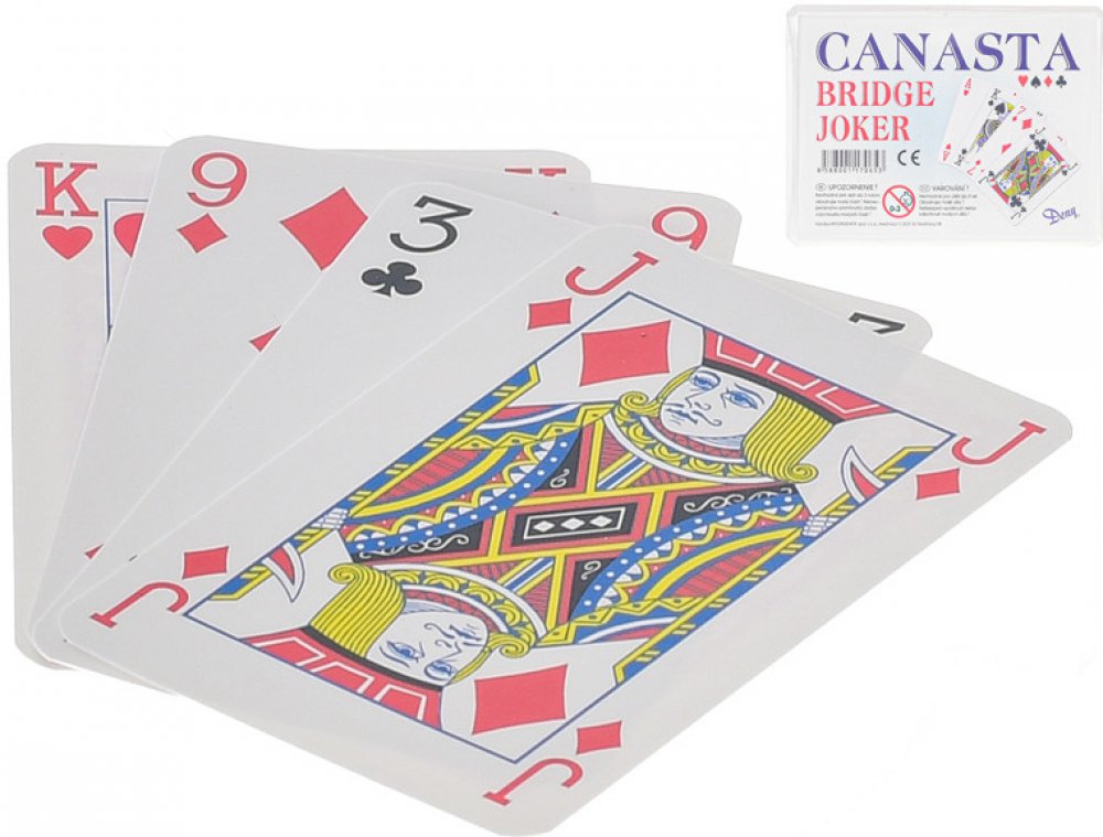 MIKRO TRADING - Karty Canasta 108ks v plastové krabičce ve fólii Kanasta je skutečnou herní klasikou. Rozvíjí bystrost, schopnosti a dovednosti dětí. Určené pro děti vě věku 3 let. Balení obsahuje: 108ks karet v plastové krabičce.