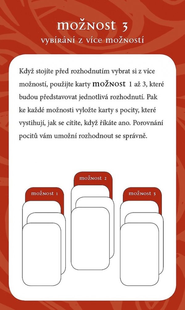 Karty emocí vám pomůžou, abyste si lépe uvědomili, jak se skutečně cítíte – a pak uvidíte, že situaci, ve které se nalézáte, můžete změnit. Balíček obsahuje 60 karet, kdy každá z karet představuje základní emoci a v její dolní části jsou popsány tři související pocity. Dále je v balíčku 12 karet s pokyny, jak s kartami pracovat a 5 prázdných karet, které vám umožní vytvořit si karty s vlastními emocemi.