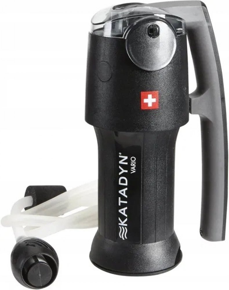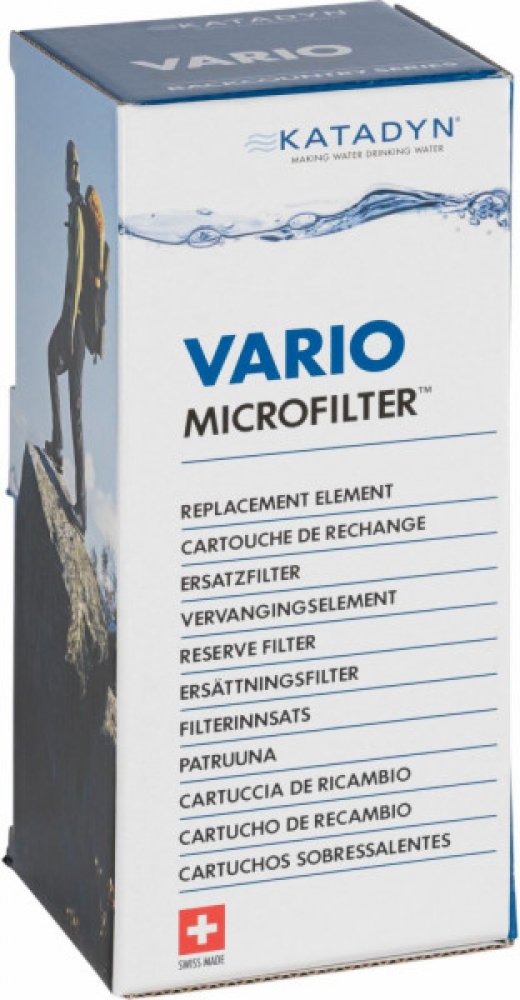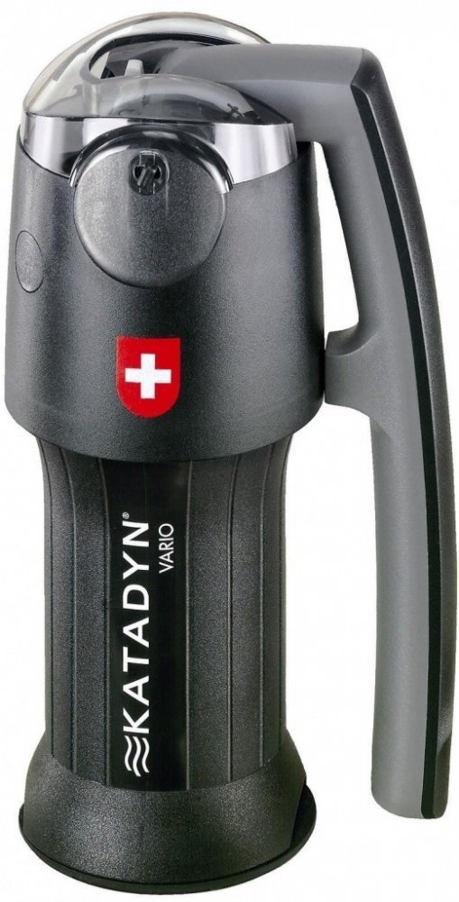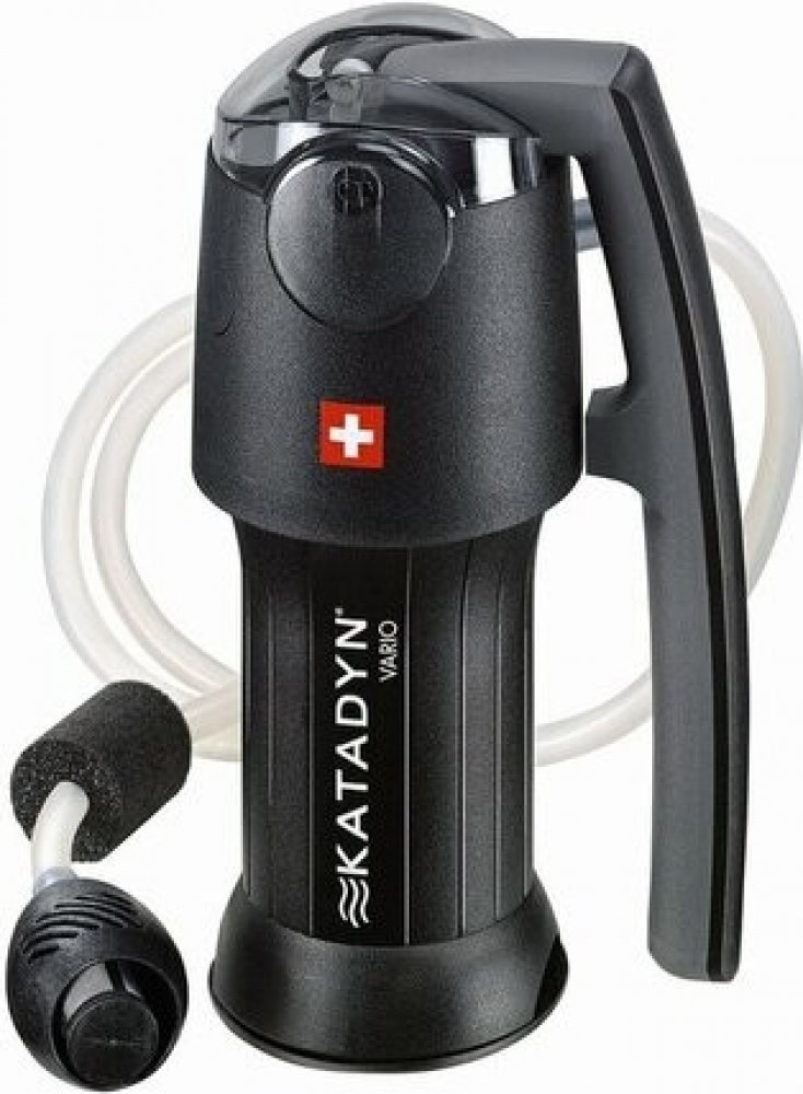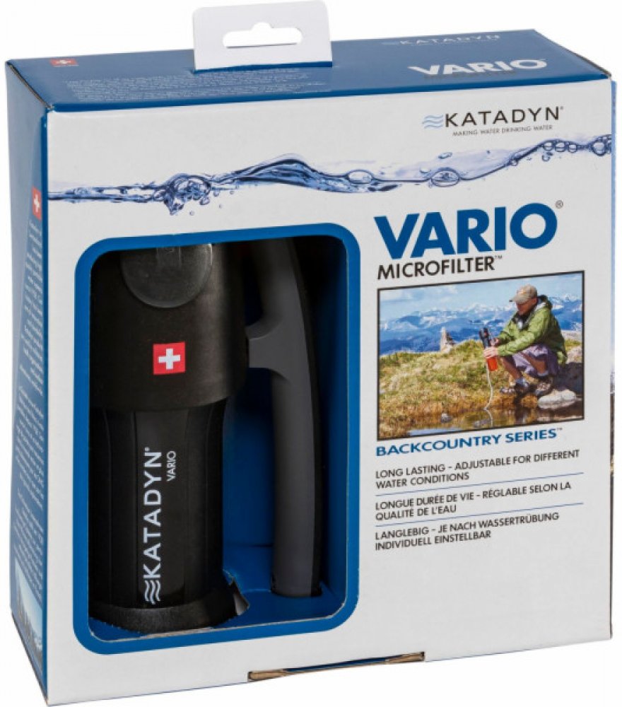 KATADYN Vario je synonymem inovace, kombinuje maximální účinnost (pomocí dvojčinné pumpy) s nejjednodušším ovládáním. Filtrace pomocí Varia je tříúrovňová - sestává z čistitelného keramického předfiltru nastavitelného v závislosti na míře zakalení vody, vysoce účinného filtru ze skelných vláken a kolony s aktivním uhlíkem zlepšujícím chuť vody. Je-li zapotřebí 2 l vody za minutu, filtruje se přes sklovláknitou membránu a aktivní uhlí. Je-li voda zakalenější, instaluje se keramický předfiltr prodlužující životnost sklovláknité kartuše. Vario je kompatibilní s většinou hydratačních lahví (se širokým hrdlem, např. typu Nalgene) a vaků (díky univerzální sponce) na trhu.