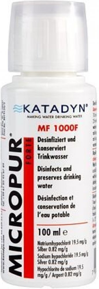 Konzervační prostředek na pitnou voduKonzervace vody Katadyn Micropur Forte účinně neutralizuje bakterie a udržuje vodu čerstvou až 6 měsíců bez choroboplodných zárodků, řas a zápachu. Díky tomu je ideální pro uchovávání vody v karavanu.Klíčové vlastnosti konzervace vody Katadyn Micropur Forte MF 1000F:Obsahuje chlornan sodný, kterým odstraňuje mikroorganismy.Konzervuje vodu až 6 měsíců působením iontů stříbra.Vhodný do zemí, kde není zaručena nezávadnost vody z kohoutku.Vhodný pro všechny nádrže na vodu.Použití a dávkování přípravku Katadyn Micropur Forte MF 1000F:Dávkování: 1 ml na 10 litrů vody v nádrži.Nalijte požadované množství přípravku do vody v nádrži.Následně nechte působit 30 minut v teplé vodě nebo 2 hodiny ve studené vodě (< 10 °C).Voda je připravena k použití.Parametry konzervace vody Katadyn Micropur Forte MF 1000F:obsah balení: 100 mlhmotnost: 149 g