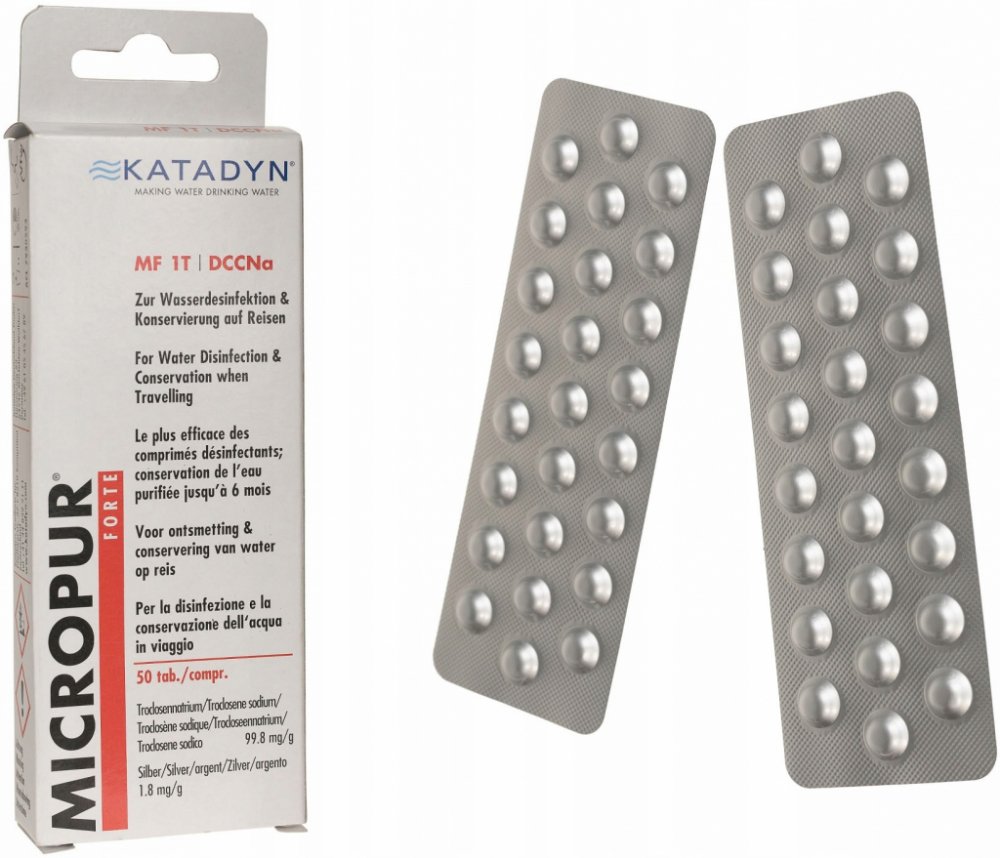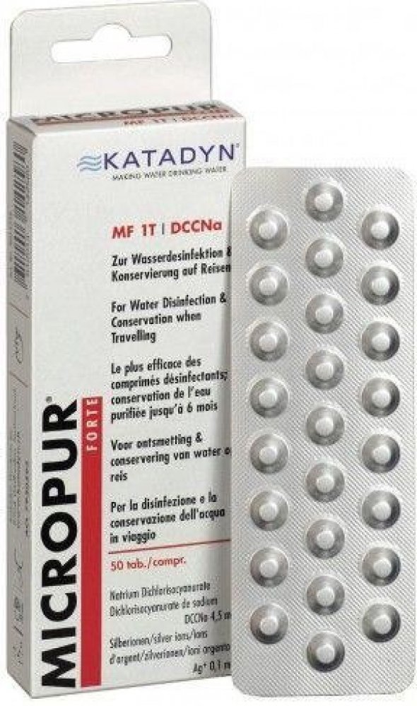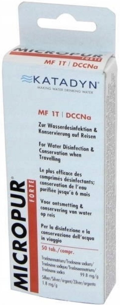 MICROPUR Forte MF 1T může zanechat jemnou chlorovou příchuť, a při vaření nebo přímé konzumaci vody je proto vhodné upravit chuť vody přípravkem MICROPUR Antichlorine MA 100F. Přípravek splňuje veškeré náležitosti stanovené vyhláškou č. 409/2005 Sb., o hygienických požadavcích na výrobky přicházející do přímého styku s vodou, a požadavky zákona č. 258/2000 Sb., o ochraně veřejného zdraví. Ministerstvo zdravotnictví ČR vydalo k 1. červnu 2009 povolení k uvedení přípravku Micropur Forte MF 1T na český trh. Balení: 50 tbl. ve 2 blistrech po 25 tbl. -