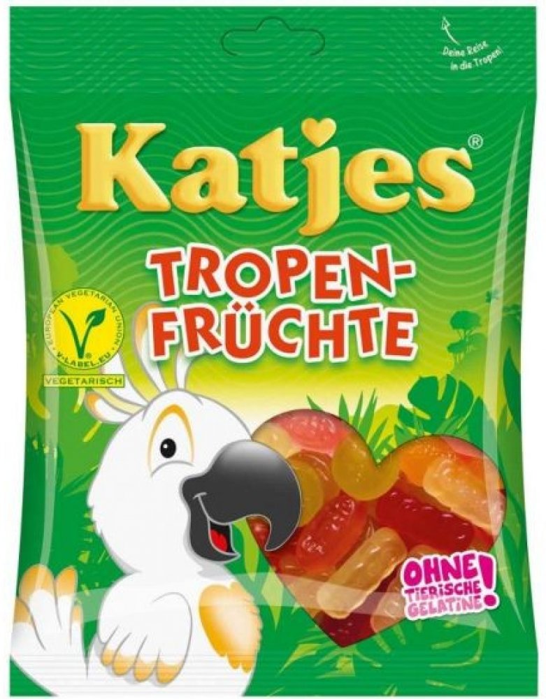 Směs ovocné gumy s příchutí tropického ovoce, 6 druhů. S přírodními příchutěmi a barvivy. Bez želatiny. Vhodné pro vegetariány.Získá exotické ovoce s tropickým ovocem Katjes. Protože lahodná, měkká ovocná guma je vyrobena ze skutečného ovocného džusu a mangového pyré. Uvolněte se a nechte příchutě manga, exotiky, mučenky, grapefruitu, tropiky a kiwi přenést vás na vaši slunečnou dovolenou. Mimochodem - příchuť je napsána na každém kousku.KontaktKatjes Fassin GmbH + Co. KG, Dechant-Sprünken-Str. 53-57, 46446 EmmerichpřísadCukr, glukózový sirup, modifikovaný škrob, glukózo-fruktózový sirup, 6 ovocná šťáva z koncentrátu ovocné šťávy (2,7 jablko, 1,1 kiwi, 0,9 mandarinka, 0,3 maracuja, 0,3 černý bez, 0,3 ananas, 0,2 krvavý pomeranč, 0,2 grapefruit, 0,02 guava), okyselující látky (kyselina citrónová, kyselina jablečná, kyselina mléčná, 1 mangová dužina, přírodní aroma, přírodní citrusová příchuť), zahušťovadla (svarobová guma a xanthanová guma), ovoce a rostlina koncentráty (jablko, světlice barvířská),