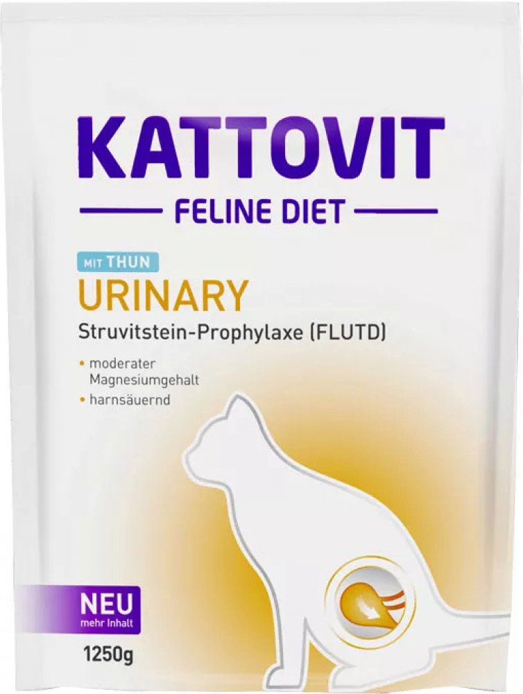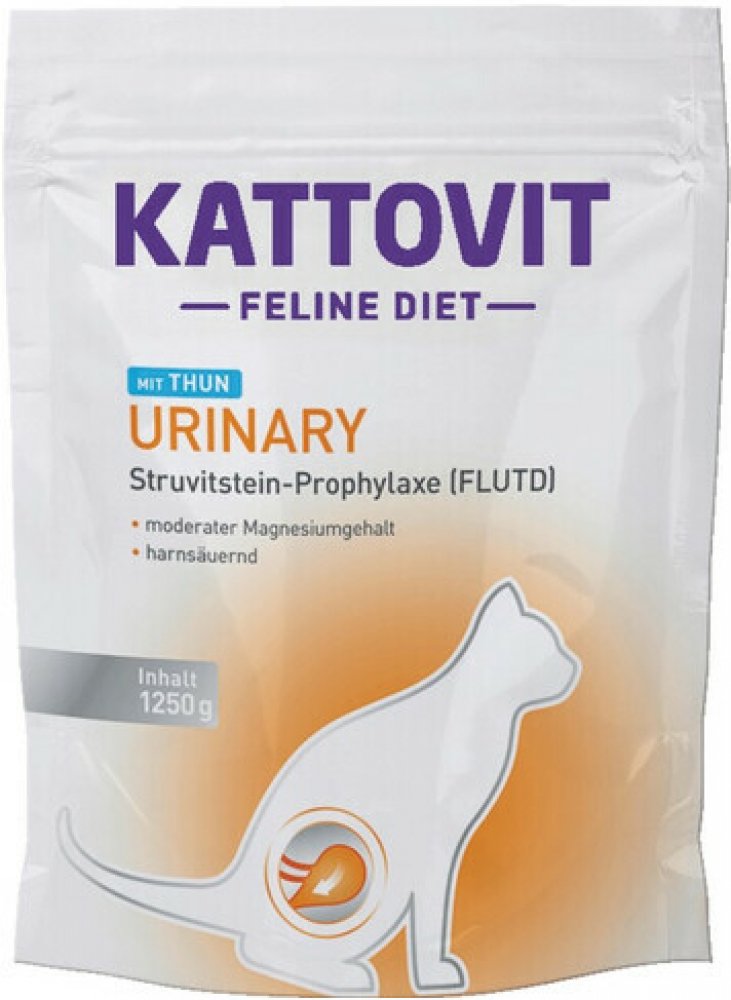 Aby se zabránilo tvorbě močových kamenů (FLUTD), bylo složení krmiva navrženo tak, aby pH kočičí moči 6,4 bylo jednoznačně v nízkém rozmezí. Kattovit Urinary obsahuje látky okyselující moč a nízký obsah hořčíku. Vysoká stravitelnost a energetická hustota suchého krmiva pro kočky jsou důležité pro další profylaxi.