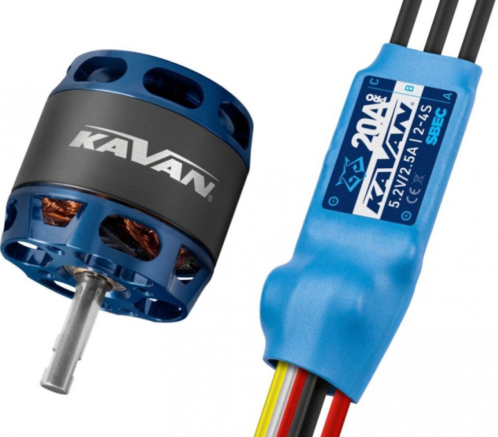 Combo set Kavan PRO 2826-1200 & Kavan PRO-20SB. Combo set střídavého elektromotoru s rotačním pláštěm a 20A regulátoru otáček pro RC modely letadel. Set je vhodný pro větroně do hmotnosti 450 g, trenéry do hmotnosti 450 g a akrobaty do hmotnosti 400 g a 3D akrobaty do hmotnosti 330 g. Napájení: Lixx 2S–3S, průměr hřídele: 4,0 mm.