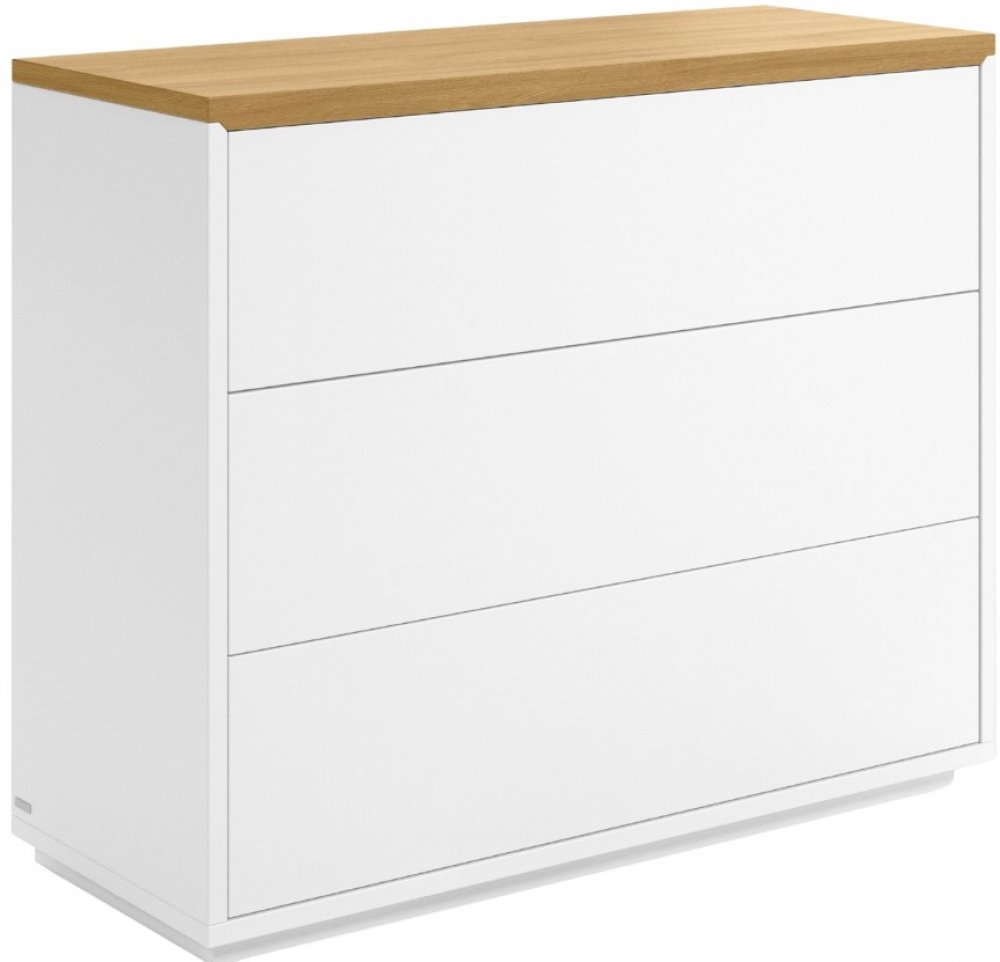 Komoda Abilen od značky Kave Home v bílé barvě s dubovým dekorem se stane jedinečným a stylovým doplňkem vašeho interiéru. Obdélníkový korpus z bíle lakované MDF desky nabízí prostorný úložný prostor díky 3 zásuvkám. Atraktivní kontrast dodává horní deska z dubové dýhy, a díky tomu se tato komoda se hodí nejen do moderních, ale i klasických interiérů.