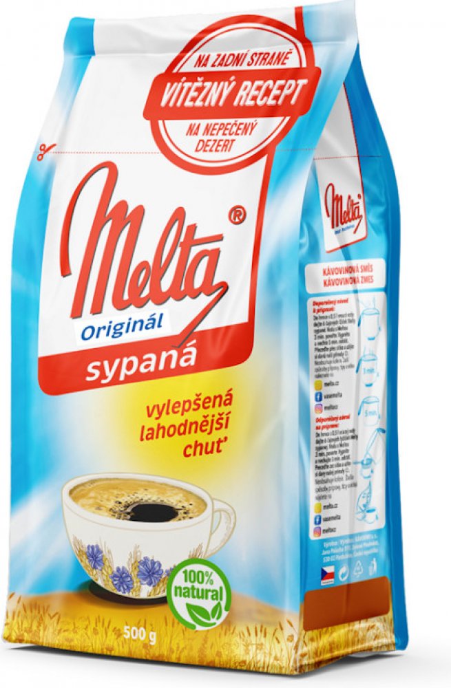 Použití: Do litru vroucí vody přidáme 4 rovné polévkové lžíce Melty. Krátce se povaří, nechá 3 minuty ustát a pak se přecedí. Pro udržení dobrých chuťových vlastností nedoporučujeme nechávat sedlinu v odvaru, ani kávovinu ohřívat. Takto připravený nápoj je možné pít teplý i studený.