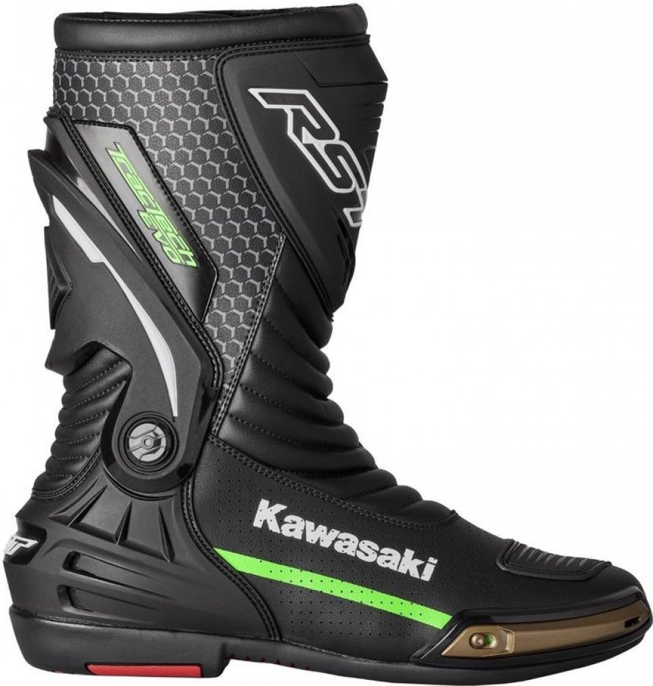 Boty na motorku Kawasaki Pánské sportovní jezdecké boty TURIN II navržené pro maximální pohodlí a bezpečnost, byly vyvinuty s bezpočtem hodin na silnici a závodní dráze. Boty mají certifikaci CE na úroveň 2/2/2/1, což je jedna z nejvyšších úrovní ochrany, a standardně se dodávají s tvarovaným TPU chráničem na patě a TPU chániči holení, které nabízí maximální ochranu proti nárazu. KONSTRUKCE: