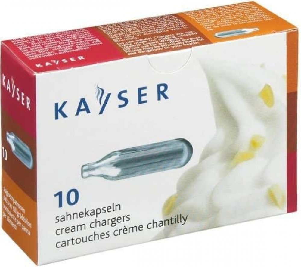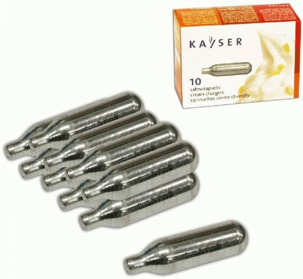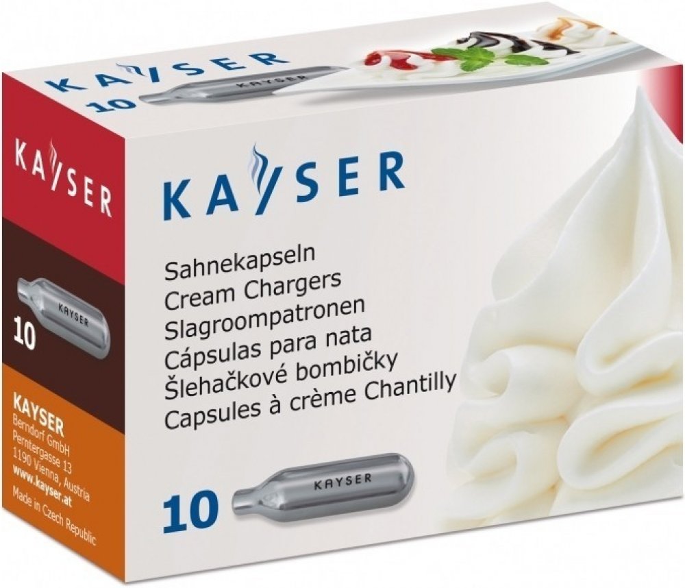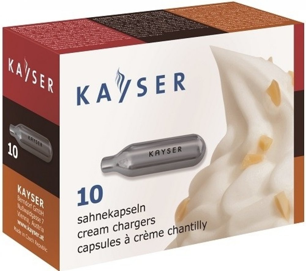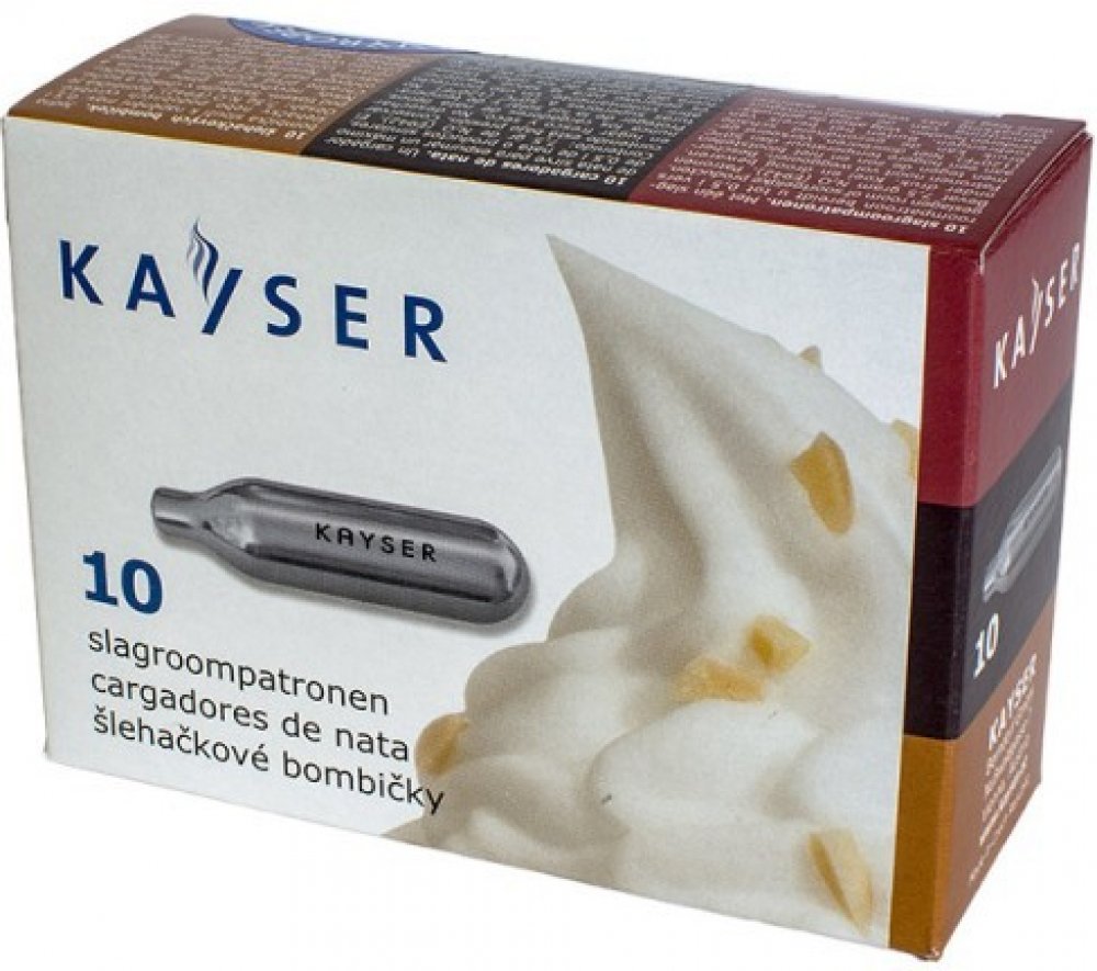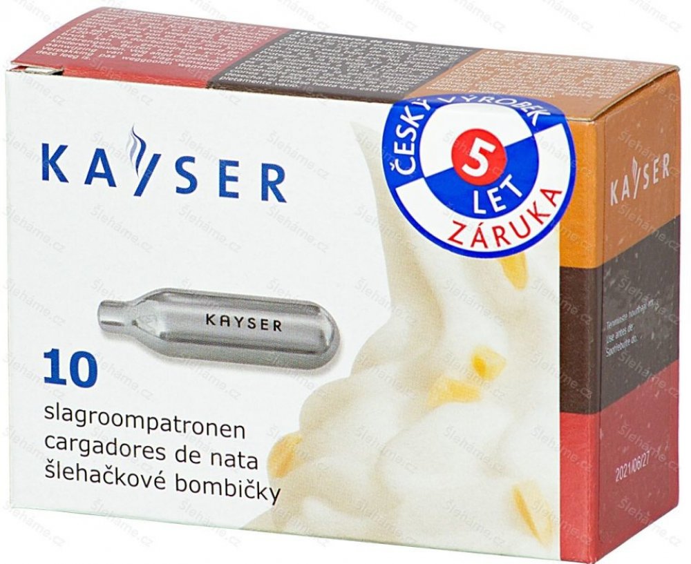 Jedna šlehačková bombička Kayser je určena pro nášleh maximálně 0.5 l smetany či jiného obsahu šlehače. Plněno čistým oxidem dusným (N2O) určeným pro potravinářské účely. Vyrobeno v České republice.