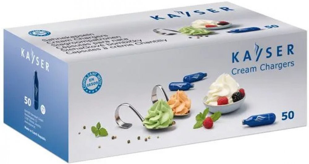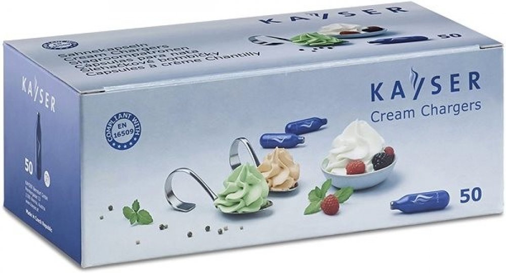 Šlehačkové bombičky Kayser jsou určené do šlehačkových lahví Kayser, Tescoma, Hendi, Orion, Banquet, ISI, Mosa i Liss. Na ušlehání 0,5 l smetany v dokonalou šlehačku postačí jedna bombička. Součástí balení je 50 jednorázových bombiček s 99,95% čistotou plynu. Vyrobené jsou z recyklovatelné oceli. Šlehačkové bombičky Kayser vám usnadní přípravu šlehačky. Klíčové vlastnosti jednorázových šlehačkových bombiček Kayser 8 g 50 ksŠlehačkové bombičky určené do šlehačkových lahví Kayser, Tescoma, Hendi, Orion, Banquet, ISI, Mosa i LissNa ušlehání 0,5 l smetany v dokonalou šlehačku postačí jedna bombičkaSoučástí balení je 50 jednorázových bombiček KayserS 99,95% čistotou plynuVyrobené z recyklovatelné oceli
