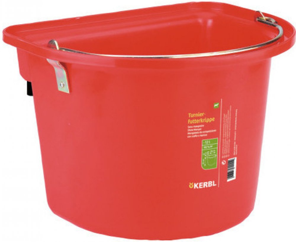 Kbelík pro koně o objemu 12 l s pevnými, závěsnými, kovovými držáky lze zavěsit do přívěsu či boxu. Kbelík není vhodný na vodu - voda protéká nýty.