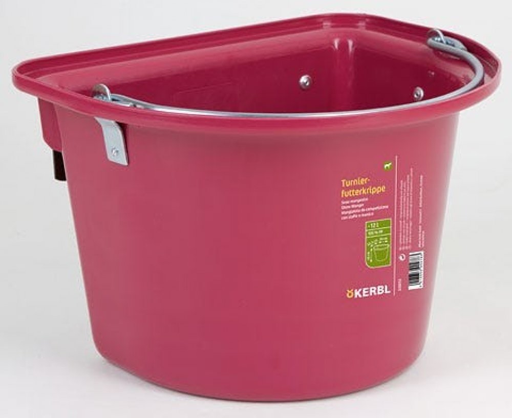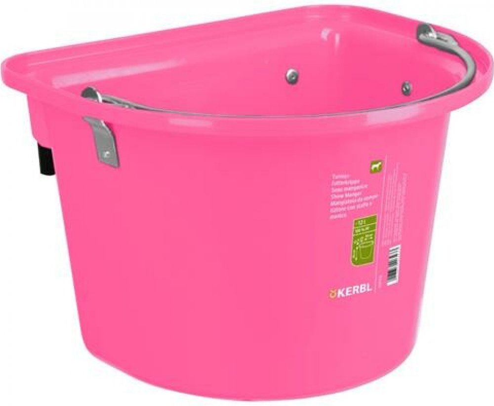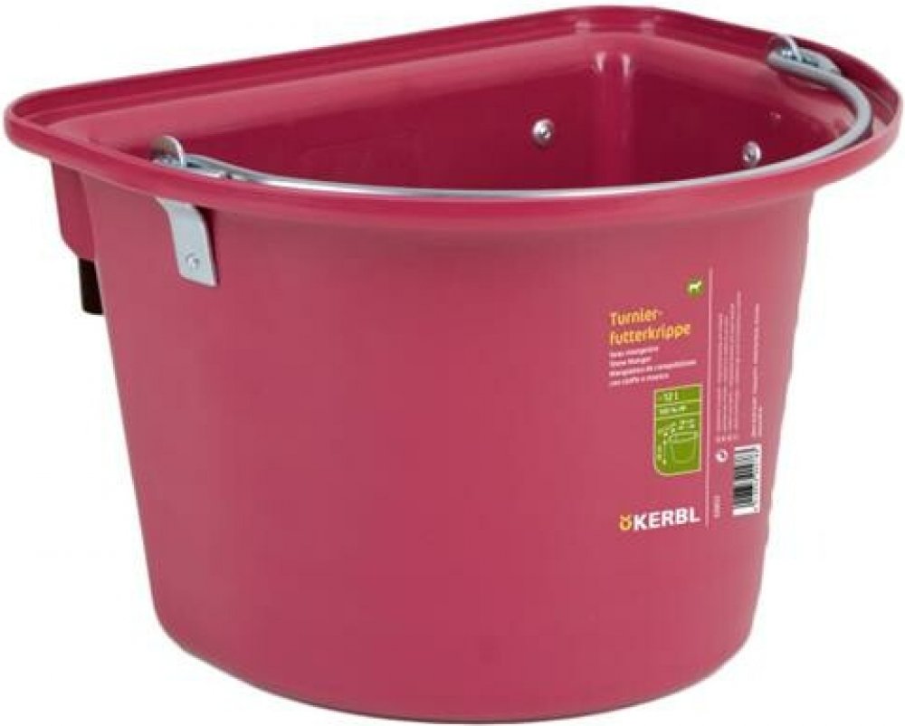Kbelík pro koně o objemu 12 l s pevnými, závěsnými, kovovými držáky. Možné zavěsit do přívěsu či boxu. Kbelík není vhodný na vodu (voda nýty protéká).