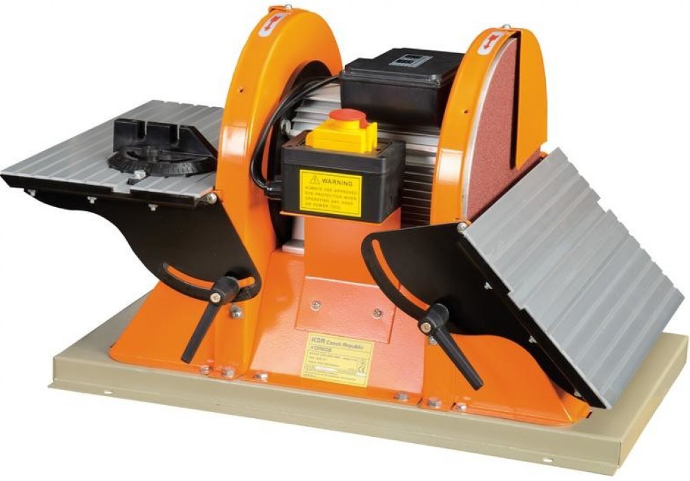 Dvoukotoučová bruska je určena k broušení dřeva, hliníkových slitin a všech druhů umělých hmot. V základním vybavení je naklápěcí stůl se stupnicí a úhlovací pravítko. Přístup ke kotouči na výměnu brusného plátna je umožněn po demontáži krytu.