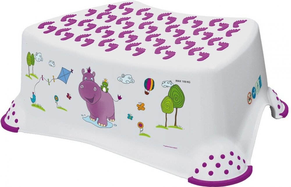Lehká a stabilní dětská stolička Keeeper s motivem hrošíka a protiskluzovou úpravou pomáhá dětem k větší samostatnosti.