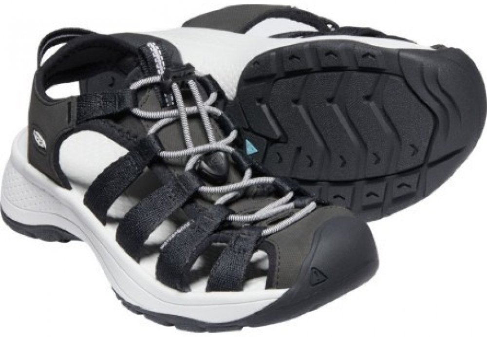 Dámský sportovně-outdoorový sandál Keen Astoria West Sandal vhodný pro všestranné použití, zaujme svým elegantním vzhledem. Svršek je zhotoven z voděodolného materiálu z recyklovaných PET lahví. Ze stejného materiálu je také bungee rychlozavazování. Model má rychleschnoucí podšívku a kvalitní gumovou podešev Aquagrip s jemným lamelováním členěným podle nášlapových zón, které výrazně snižuje pravděpodobnost uklouznutí na mokrém povrchu. Stabilizační klenek zvyšuje jistotu došlapu v terénu. Ekologicky šetrná technologie ECO ODOR CONTROL brání tvorbě mikroplísní a zápachu uvnitř boty.