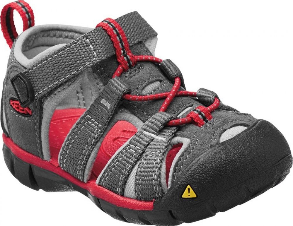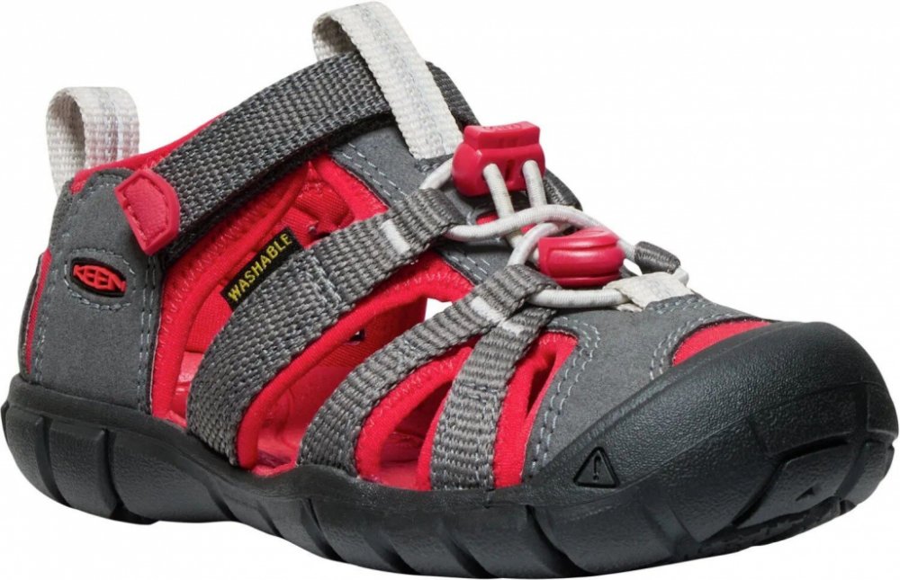 Dětské sandály KEEN Seacamp II CNX Tots - magnet/red carpetOutdoorové sandálky jsou velmi lehké, pohodlné a vaše děti si je okamžitě zamilují. Díky pružnému šněrování si je malí dobrodruzi snadno nazují i vyzují a mohou v nich vyrazit téměř kamkoliv. Tyto sandálky jsou naprosto univerzální a vhodné i pro nejmenší. A když se boty náhodou opravdu hodně zašpiní, můžete je v klidu vyprat v pračce. Proto je milují i rodiče. KonstrukceUzavřená pata umožňuje pohyb i v náročnějším terénu.Podrážka je měkká, ale má dobrou přilnavost, díky níž neklouže ani na mokrém povrchu, a navíc nedělá šmouhy.Rychleschnoucí popruhové pásky zvládnou i neplánovanou koupačku.Pásek umožňuje dokonale stáhnout botu i kolem užších kotníků.Nepostradatelným benefitem je pro děti rovněž patentovaná ochrana prstů typická pro obuv Keen.Boty jsou ošetřeny přírodní antibakteriální technologií ECO ODOR CONTROL proti zápachu a dají se prát v pračce.