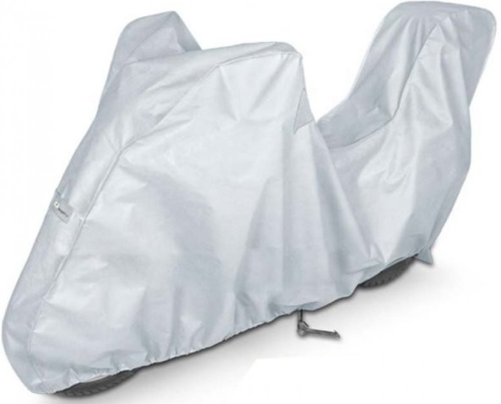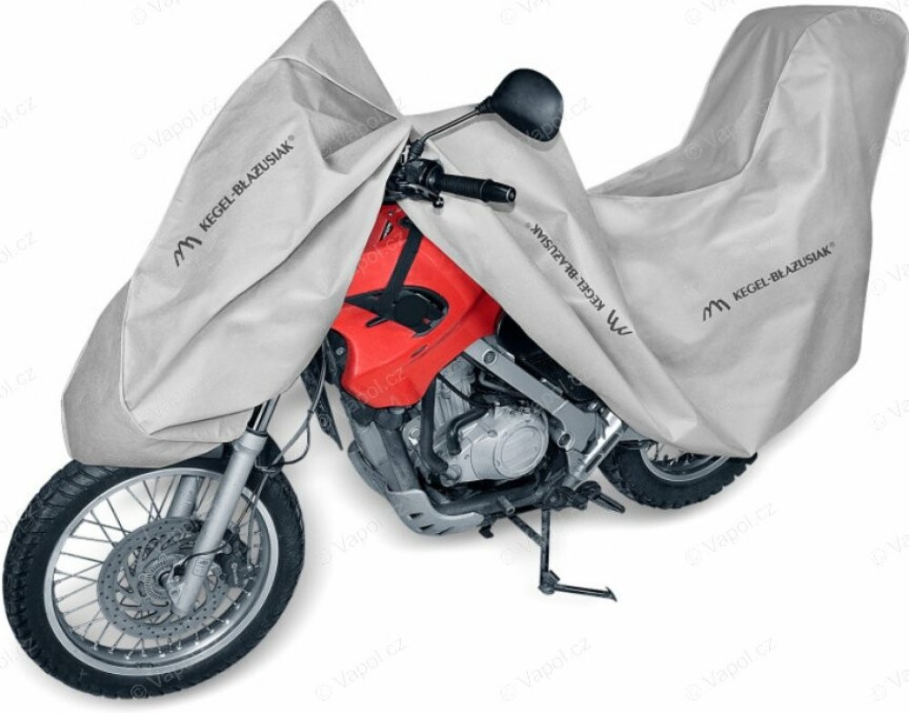 Plachta na motocykl , velikost XL, nepromokavá, proti prachu a znečištění. Tato plachta umí odvádět nežádoucí vlhkost z pod plachty. Snadné je i její nasazení a sundání. Speciální třívrstvá nepromokavá konstrukce plachty je zároveň paropropustná a při dešti je téměř 100% nepropustná. Plachta chrání před deštěm, UV zářením, prachem, ptačím trusem, kroupami, sněhem a námrazou. Snadno upevní pomocí šňůry, a bez problému tak odolá i silnému větru. Plachta je vhodná pro motocykl o délce 240-265 cm, výšce řídítek do 135 cm a šířce řídítek do 107 cm. Rozměry 265cm×107cm×135cm
