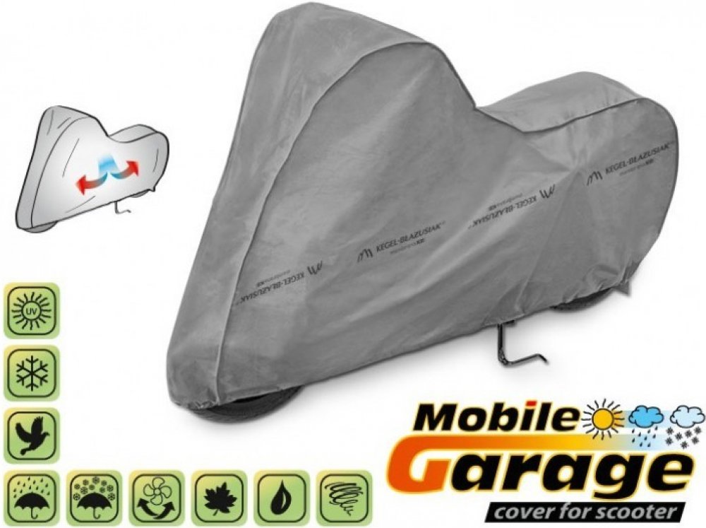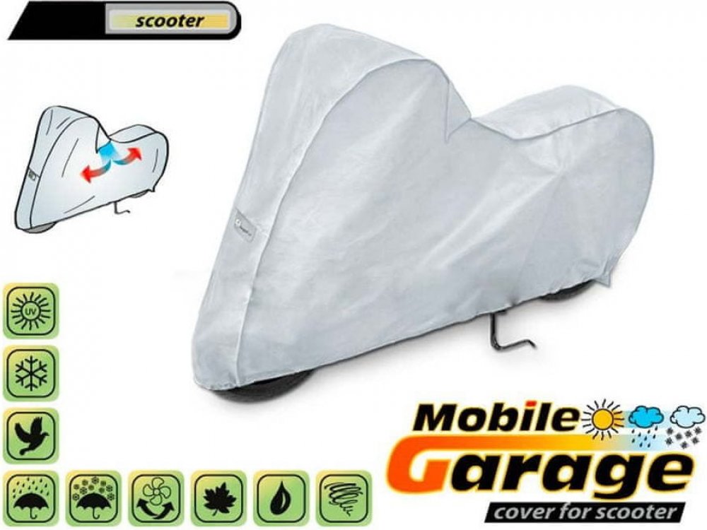 Vysoce kvalitní, voděodolná a paropropustná plachta na skútr (mobilní garáž).Vhodná pro skútr o délce 185–230 cm, s výškou řídítek do 131 cm a šířkou řídítek do 94 cm, bez boxu.