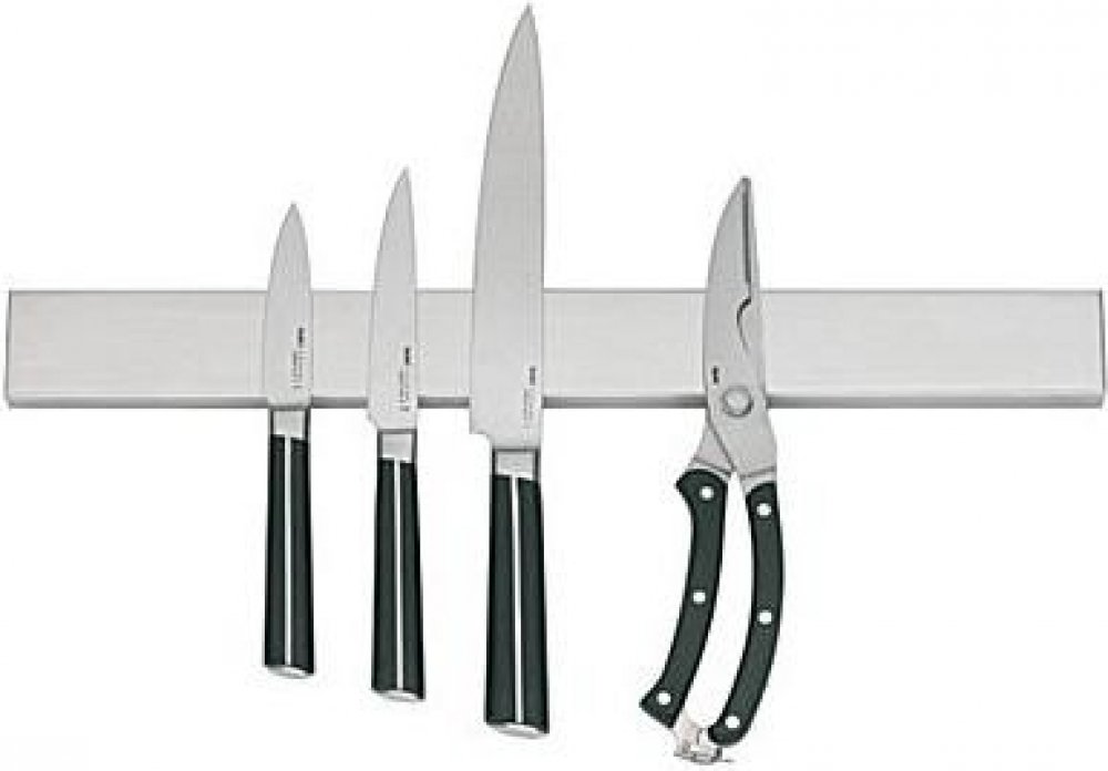 Kuchyňská magnetická lišta na nože vyrobená z nerezové oceli, nože nebo jiné menší kovové nádobí máme vždy po ruce, lištu lze umístit kdekoliv v kuchyni, možno přivrtat nebo i kvalitně přilepit, lišta má ze zadní strany nerezový hladký plech který je v rozměru lišty, tento plech se na stěnu upevní a lišta se k němu magnetem přichytí, extra silný magnet je schován v liště, balení obsahuje montážní materiál ( vruty a hmožděnky ). materiál: matný nerez, rozměry: 36 x 4,5 x 1,5 cm, nože ani nůžky nejsou součástí