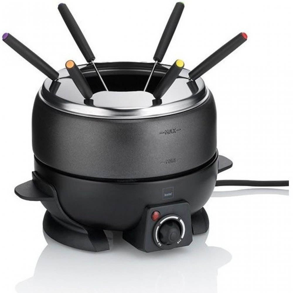 Položte suroviny na stůl a nechte hosty vybrat, co si dají. Užívejte si společné chvíle s rodinou a přáteli, zatímco se před vámi v nerezovém hrnci škvaří maso, ryby, chléb nebo zelenina. Případně jej můžete použít i na přípravu čokoládového fondue. S hrncem na fondue SIMPLON vytvoříte aktivní a příjemnou večeři.Set je vyroben z oceli s nepřilnavým povrchem a víko pak z nerezové oceli. Nerezové víko funguje jako držák fondue vidliček a zároveň zabraňuje stříkání obsahu z hrnce. Pootočením knoflíku jednoduše regulujete výkon a tedy i teplotu uvnitř hrnce. Součástí balení je také 6 vidliček, které mají na konci rukojeti barevné rozlišení, takže si každý strávník vždy najde tu svou vidličku a nesplete si ji s cizí. Tato fondue souprava je ideální až pro 6 osobVlastnosti: