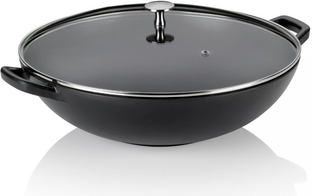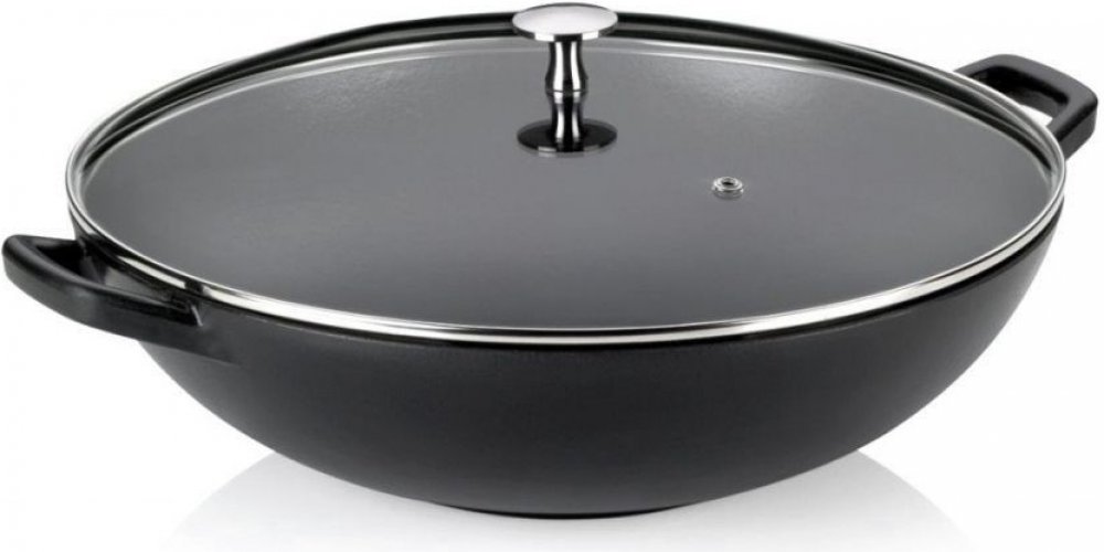 Velká woková pánev o průměru 36 cm se skvěle hodí pro přípravu tradičních smažených, dušených a pečených pokrmů z asijské kuchyně, kdy umožňuje použití na všech typech sporáků, včetně indukce. Efektivitu dušení zvyšuje dodávaná poklice s úchopem z nerezové oceli, která je opatřená otvorem pro únik přebytečné páry. Pečlivě vybraná kombinace materiálů poté zajištuje vyšší odolnost vůči extrémně vyso...