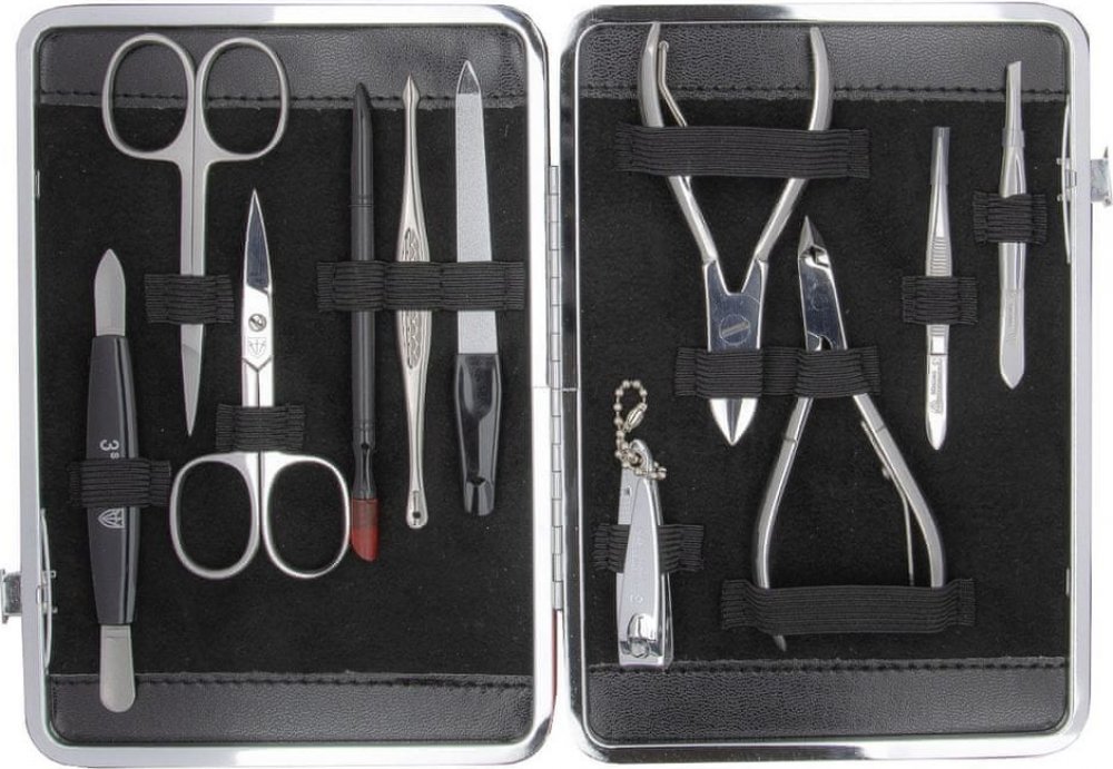 - složení: 1 x pinzeta špičatá, 1 x pinzeta šikmá, 1 x kleště na nehty, 1 x kleště na kůžičku, 1 x kleštičky/štipky, 1 x pilník, 1 x nůžky na nehty, 1 x nůžky na kůžičku, 3 x manikúrní nástroj