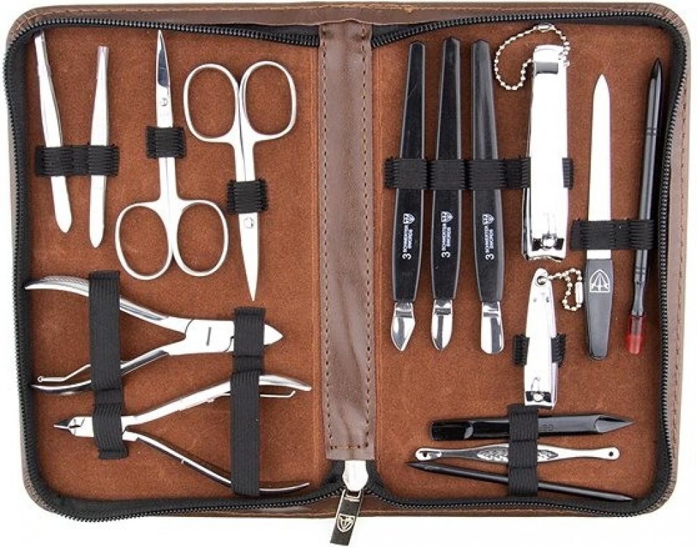 Tato velká sada na manikúru a pedikúru je bohatě vybavena a obsahuje vše, co potřebujete pro dokonalou domácí péči, která vám pomůže udržovat vaše nehty krásné a zdravé.16dílná sada je vybavena nástroji z kvalitní poniklované oceli od německého výrobce Kellermann. Nástroje jsou uloženy v hnědém pouzdru ze syntetické kůže s hladkou povrchovou úpravou a zavíráním na zip.Jednoduchý a elegantní design pouzdra v kombinaci s kvalitními nástroji činí z této sady na manikúru a pedikúru hodnotný dárek, který jistě potěší každého, kdo chce být vždy dokonale upraven. V této sadě najdete:1 x nůžky na nehty1 x nůžky na kůžičku1 x kleště na nehty1 x kleště na kůžičku1 x šikmou pinzetu1 x špičatou pinzetu1 x kleštičky/štipky malé1 x kleštičky/štipky velké1 x pilník7 x nehtový nástrojO značce Kellermann:Kellermannje německá rodinná firma s tradicí již od roku 1927, kdy byla založena Gustavem Kellermannem a jeho syny. Prvotřídní kvalita a maximální spokojenost zákazníka vždy byly, jsou a budou hlavní hodnoty této firmy. A kde jinde by mohla tato firma vzniknout než v německém městě Solingen, proslaveném výrobou nožů a nůžek?Logo - drei Schwerter - three swordsToto logo se těší dlouhé historii - dříve byl tento znak používán nožaři a kováři mečů. Nyní ono logo se třemi meči, mířící špičkou dolů, symbolizuje jednotu a sílu. Od roku 1927 uplynula dlouhá doba a mezitím se vedení předávalo ze syna na syna, kteří byli mistři ve svém oboru a pilně se v něm vzdělávali. Od roku 2005 leží budoucnost značky v rukou Larse Kellermanna. Značka se může pyšnit svou zaslouženou dobrou pověstí - ať už kvůli dlouhé životnosti výrobků či jejich vkusnému designu.