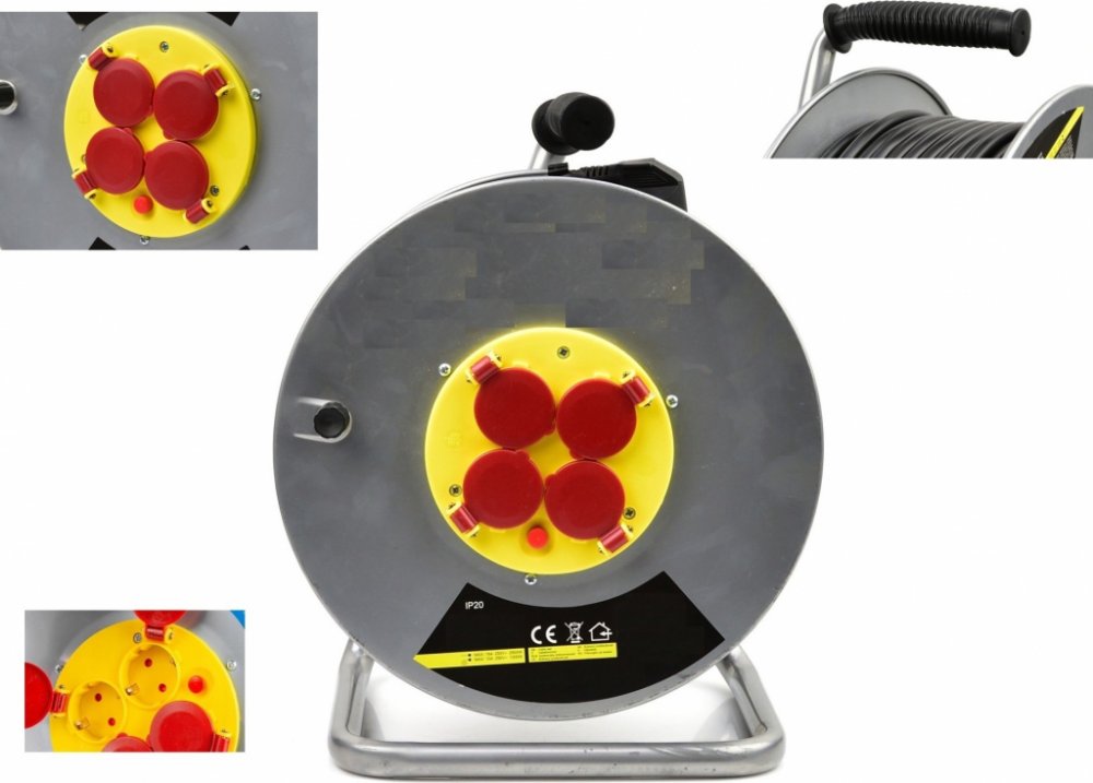 Prodlužovací kabel na kovovém bubnu se čtyřmi zásuvkami s dětskou a tepelnou pojistkou, uzemněný, je ideální pro každý dům, zahradu, dílnu a staveniště. Je vybaven tepelnou pojistkou, která chrání proti přehřátí.