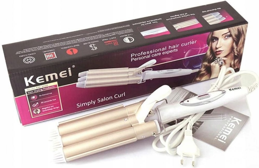 Kulma na vlasy, vlnovka na vlasy Kemei KM-1010, styling beach wavesNástroj pro úpravu vlasů s pohodlným úchopem a 3 válečky na kulmu, pro úpravu vlasů do efektních vln beach waves, povinný prvek atraktivního účesuPouze námi nabízená originální vlnovka KEMEI KM-1010 má válečky potažené keramickou vrstvouKeramická povrchová úprava nepoškozuje vlasy, zajišťuje bezpečné použití a funkce ionizace zajis...