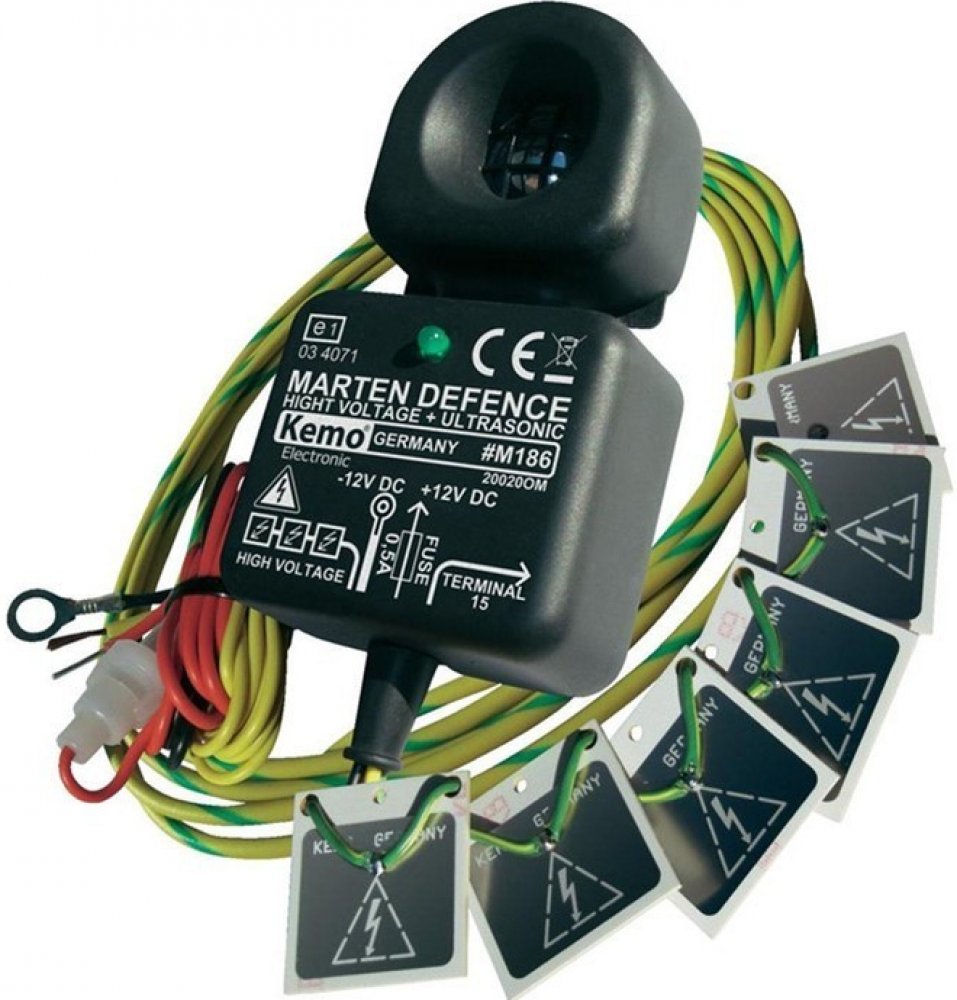 Odpuzovač kun a hlodavců s vysokonapěťovými plochami Kemo M186 Ultrazvukový odpuzovač kun a hlodavců se šesti vysokonapěťovými plochami. Kvalitní německý produkt určený pro použití v automobilech, zemědělských strojích, traktorech - zapojení přes zapalování vozidla. Zařízení vysílá ultrazvukový signál s frekvencí 22 kHz. Navíc obsahuje 6 vysokonapěťových destiček, které jsou kondenzátorem nabité na 300 voltů. Tyto vysokonapěťové destičky se instalují pod kapotu do motorového prostoru na místa přívodní vzduchové hadice, startovacích kabelů a podobně. Při dotyku s plochou dostane zvíře elektrický šok, který ho okamžitě zaplaší. Vysokonapěťová destička se automaticky znovu nabije. Extrémně nízká spotřeba energie (