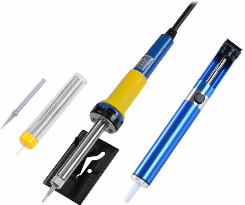 Obsahuje pájku s náhradním hrotem a stojánkem, odsávačku cínu a cín.